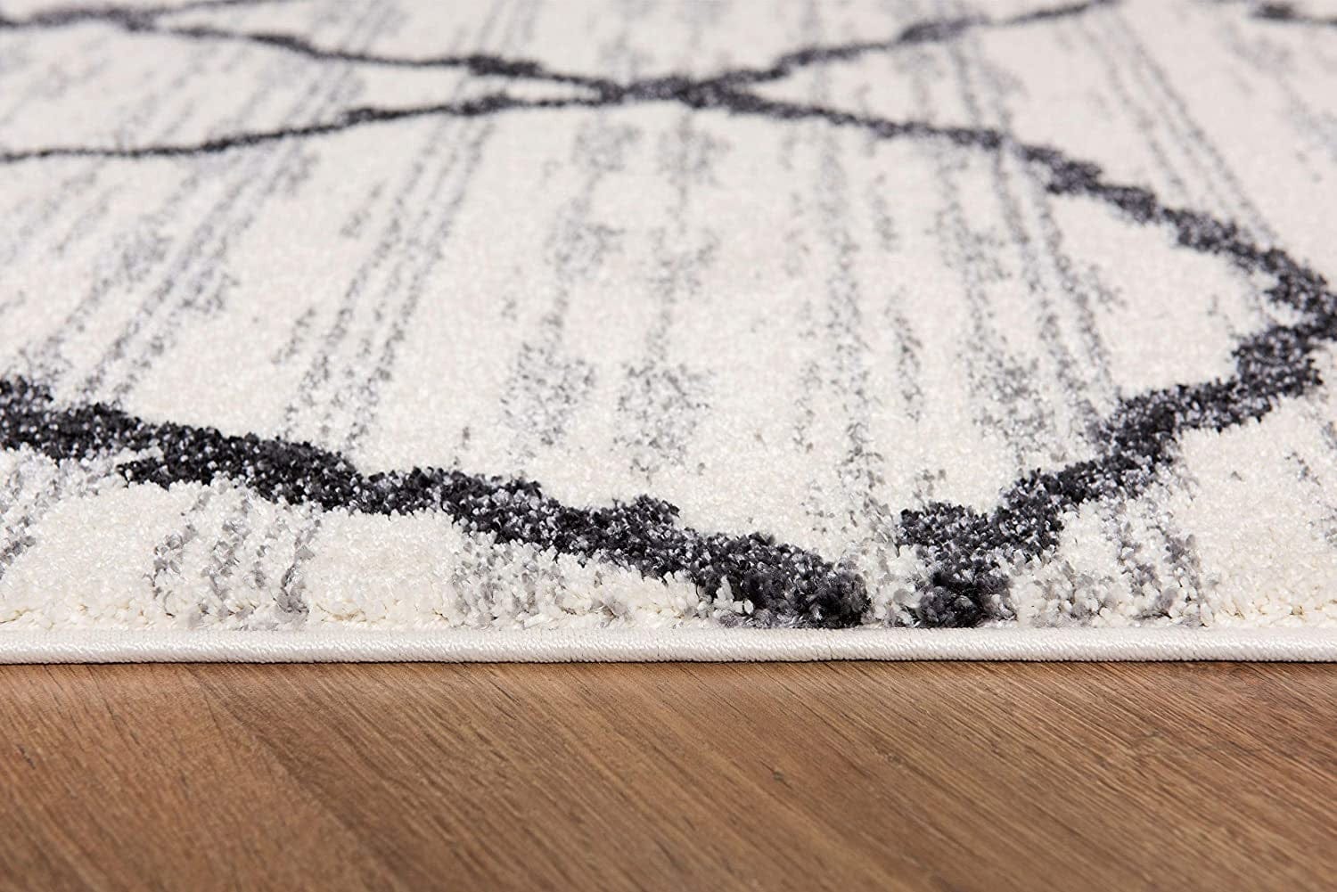 Engaging in the sophistication of Contemporary styling, this Gray and Black Modern Abstract Area Rug exhibits a classic color palette to create a compelling look in any modern living space. The distorted black strings in an abstract net-like fashion add to a visual contrast over the distressed grayish-white backdrop. Crafted with care by Turkish artisans, this rug is made of 100% twisted polypropylene to resist almost all types of spillage and stains while ensuring easy cleaning and enhanced durability to withstand heavy foot traffic. The high looped pile construction not only adds to the surface interest but also offers a layer of warmth and comfort under the feet for a cozy atmosphere in your bedroom, dining space, living room, or hallway. Made to stand out on any neutral or dark-toned floor, this monochromatic area rug will tie together the aesthetics of your modern decor. 66” x 45” x 0.8”