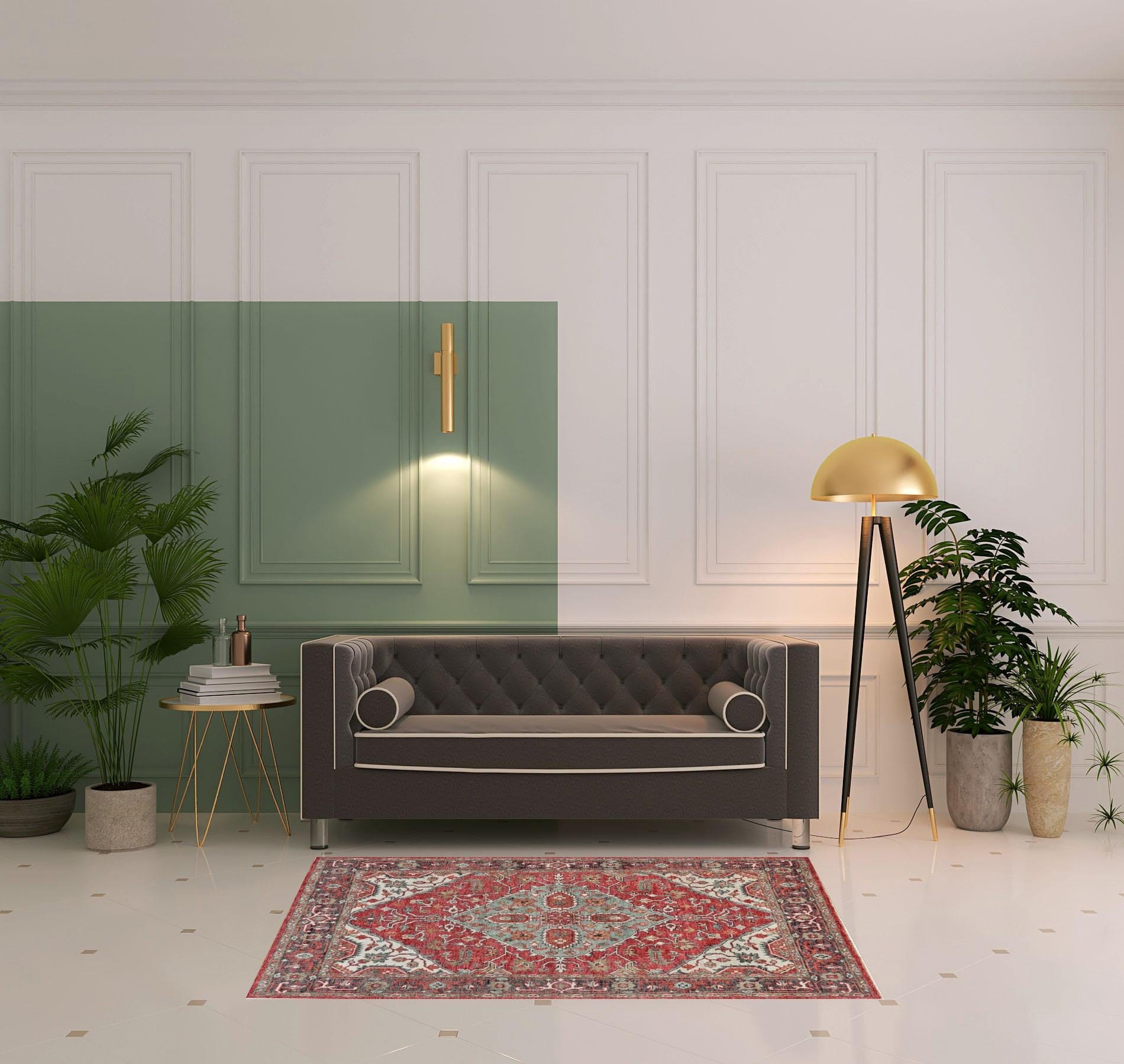 This 4' x 6' red gray and ivory wool floral hand knotted distressed stain resistant area rug with fringe, is a great way to add warmth to a room. This rectangle shaped rug features a floral design in red gray and ivory to give it visual interest. A classic shape marries with good looking design for your space Ideal for spaces with kids and pets, this rug is stain resistant to help repel stains and spilled liquids. Tassel ends bring a timeless and fashionable look to your interior. Crafted by skilled artisans, this hand knotted rug is genuine and unique. No two will be exactly alike. Place this area rug against a hardwood or tile floor and it will enliven your living space with style and sophistication. 0.28" H x 48" W x 72" D