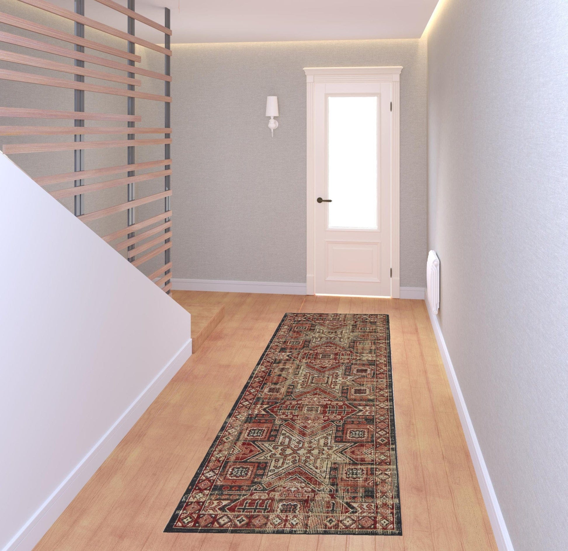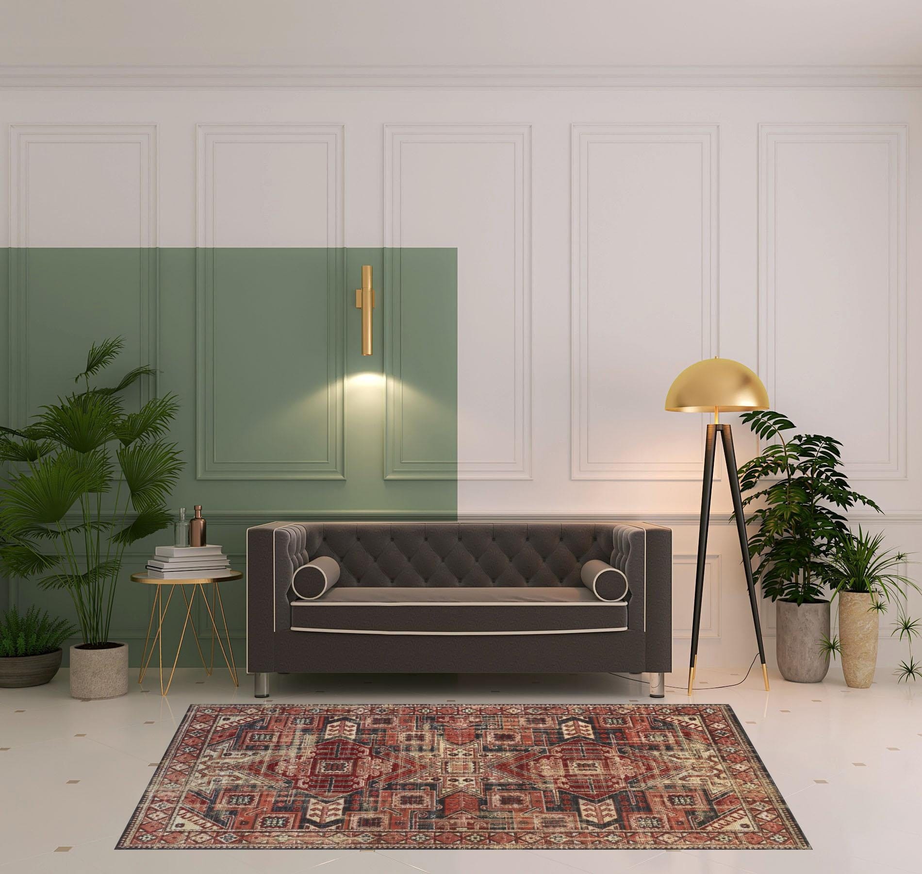 This 4' x 6' red tan and black abstract power loom distressed stain resistant area rug, is a great way to add warmth to a room. This rectangle shaped rug features a abstract design in red tan and black to give it visual interest. A classic shape marries with good looking design for your space This superior Turkish rug represents the highest quality and is built to last. Ideal for spaces with kids and pets, this rug is stain resistant to help repel stains and spilled liquids. Place this area rug against a hardwood or tile floor and it will enliven your living space with style and sophistication. 0.14" H x 51" W x 75" D