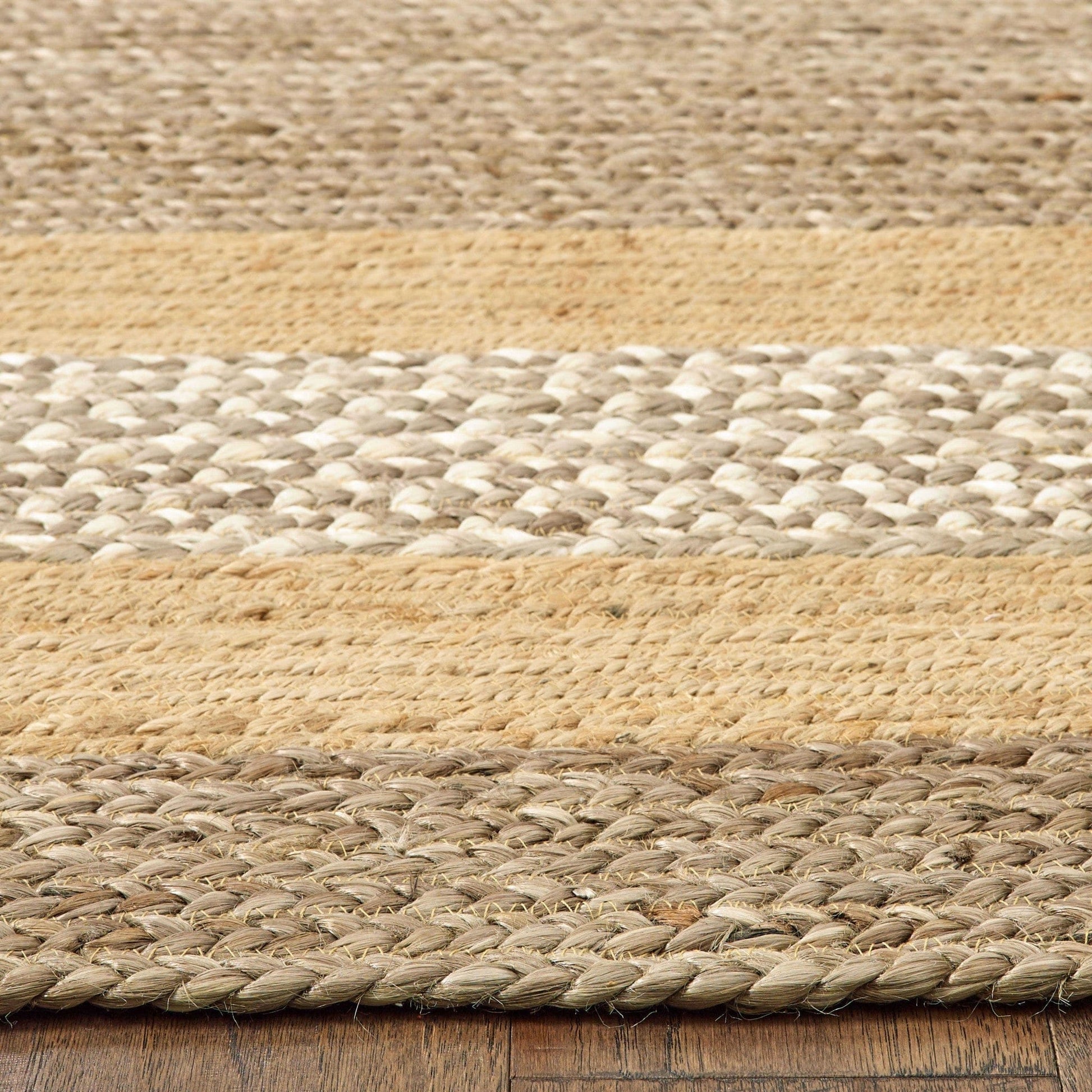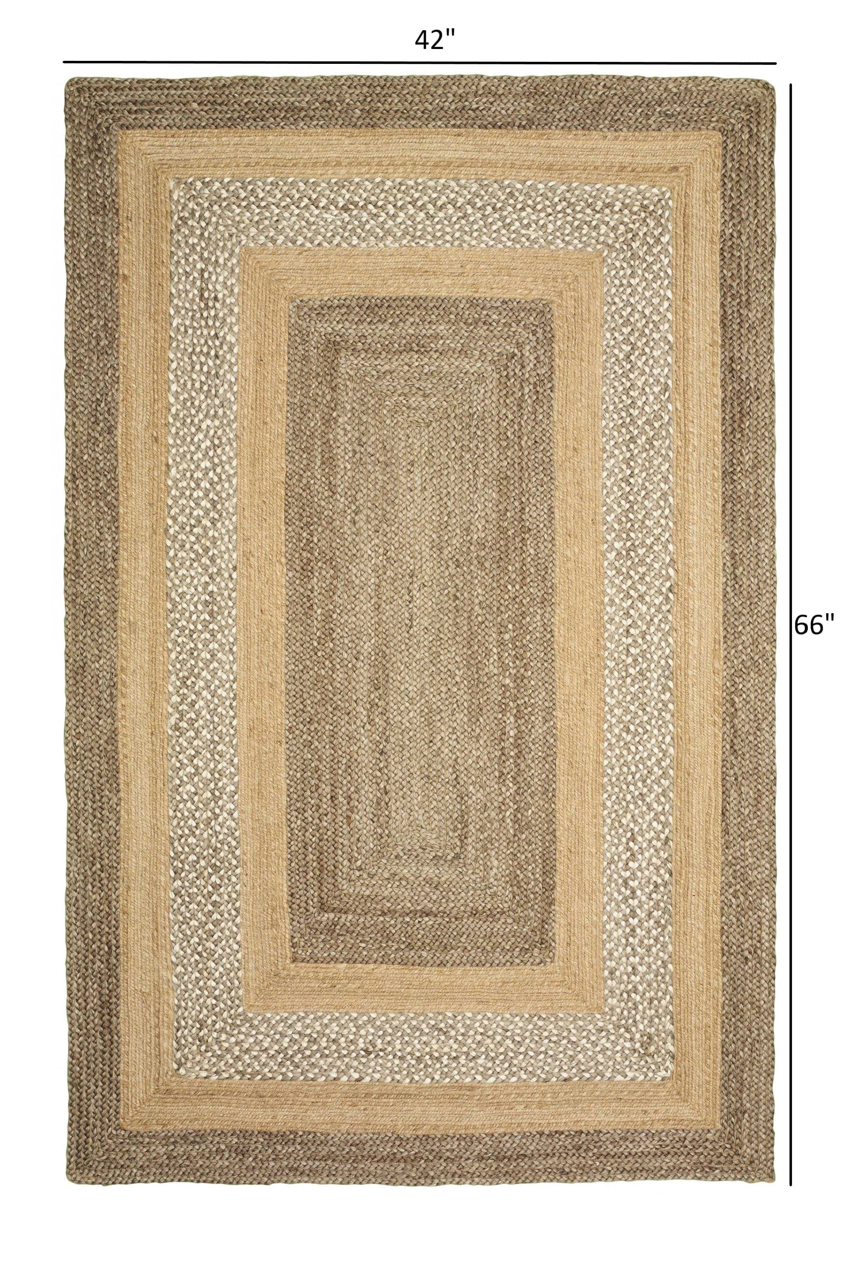 Draw the attention of the guests with this stunning Tan and Beige Bordered Area Rug that exhibits a neutral color palette in an attractive design pattern. Flaunting the geometrics of multiple borders in shades of tan and beige to create visual intrigue with a traditional vibe. Hand braided with 100% jute fibers which are naturally soft and durable to last long and prevent dirt from building up. The thick but soft weave adds to the surface texture for a comfortable and cushiony underfoot, making it a great accent for busy households. Set an inviting and cozy tone into your place with this classy area rug that will never go out of style. 42” x 66” x 0.4”