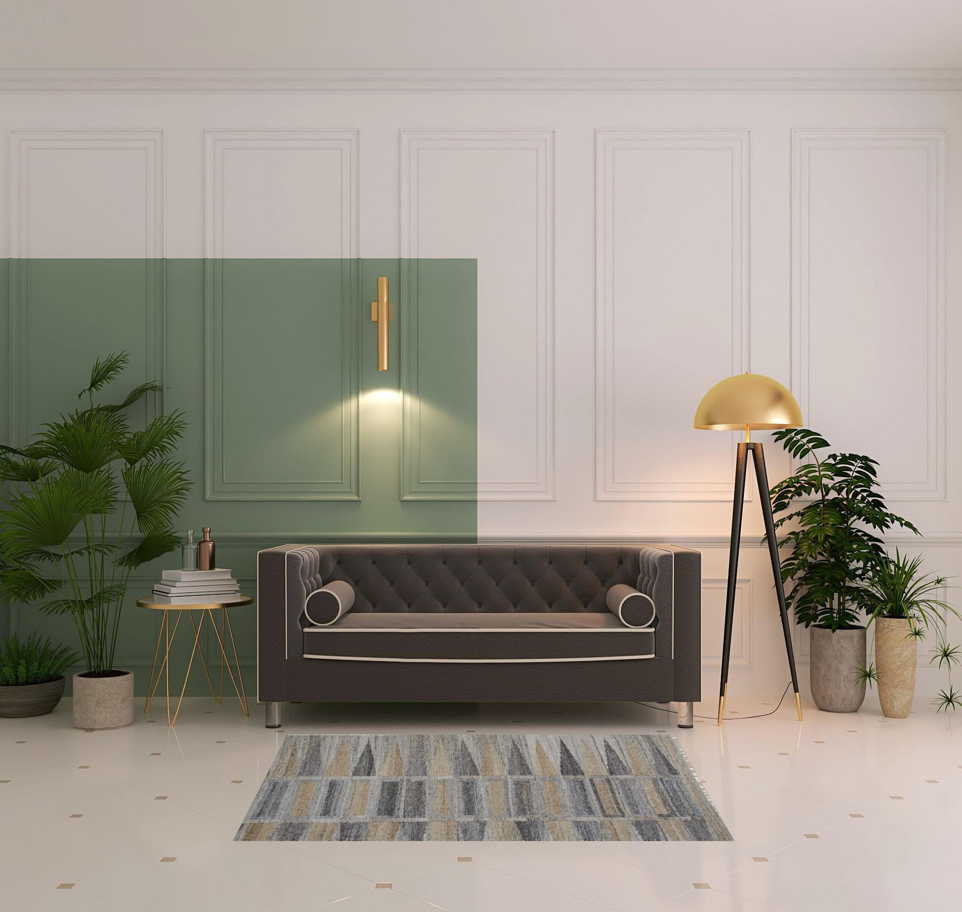 This 4' x 6' tan gray and taupe geometric hand woven stain resistant area rug with fringe, is a great way to add warmth to a room. This rectangle shaped rug features a geometric design in tan gray and taupe to give it visual interest. A classic shape marries with good looking design for your space Ideal for spaces with kids and pets, this rug is stain resistant to help repel stains and spilled liquids. Tassel ends bring a timeless and fashionable look to your interior. Crafted by skilled artisans, this hand woven rug is genuine and unique. No two will be exactly alike. Area Rugs help to give warmth and sense of home to your space. 0.25" H x 42" W x 66" D