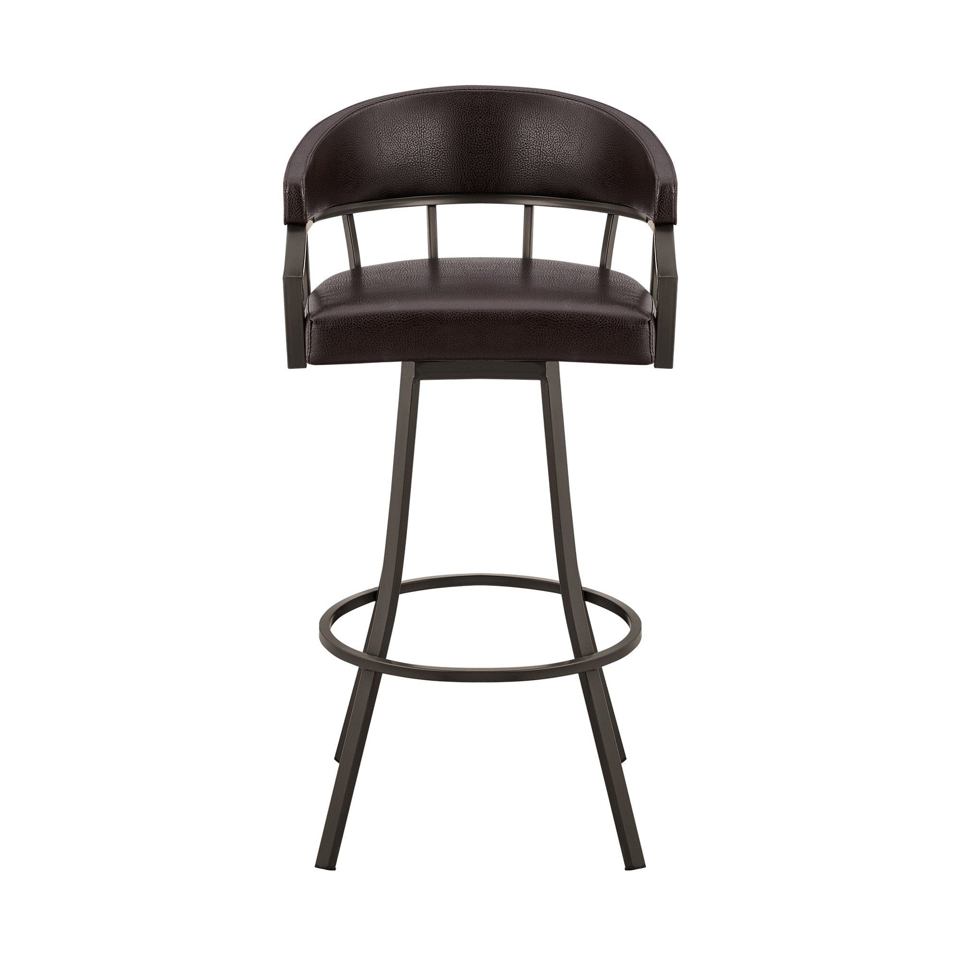With this 40" brown faux leather and iron swivel low back bar height chair you can add design and extra seating to your space. A java brown iron frame is finished off with a brown faux leather seat that is the epitome of quality construction and design. A low back mixed with a round shaped seat design makes this chair both comfortable and fashionable. The armchair design gives you a great place to comfortably rest your arms. 40" H x 21" W x 21" D