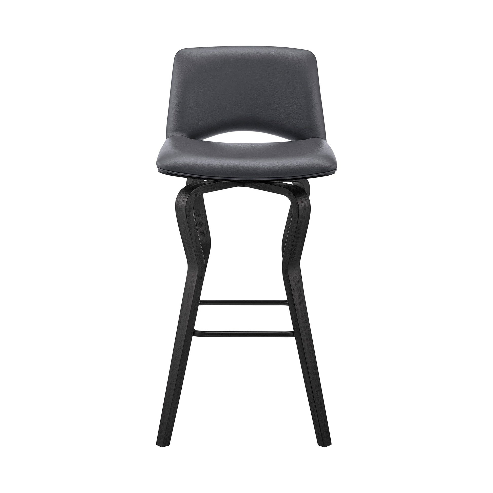 Comfortable enough to sit in for awhile, this 40" gray faux leather and iron swivel low back bar height chair will transcend the look of your room. The matte black coloration of the high quality iron base marries nicely with the gray faux leather seat. The round shape of the seat combines with a low back to give this chair a comfortable and fashionable look. This stool will look great in your dining room, kitchen, bar, or recreation room. 40" H x 18" W x 19" D