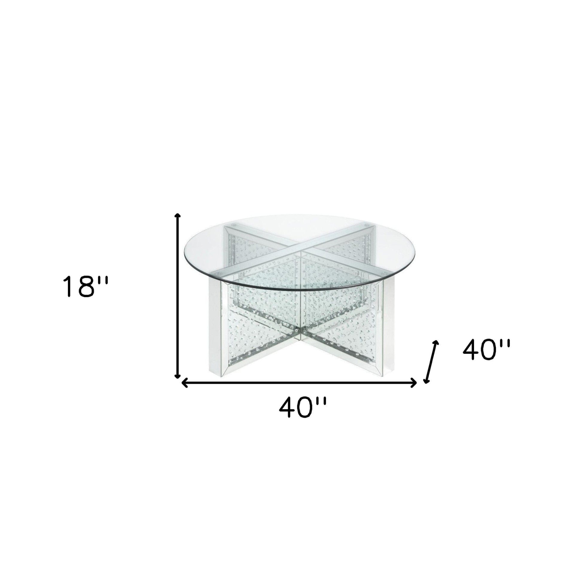 Make your living room or family room really stand out with this 40" silver and clear glass round mirrored coffee table. Quality construction from the base with embedded faux crystal gems in the x-shape, combines with clear glass of the top to give this table a fresh and updated look. Reflective pieces of mirrored glass give this table a glamorous and unique look. This round table features a fresh and stylish shape to give your room a visually pleasing accent. If you're looking for something that can fit into a living area, bedroom, or office, this coffee table is for you. This coffee table is the sturdy, reliable and stylish answer to your living room needs. 18" H x 40" W x 40" D