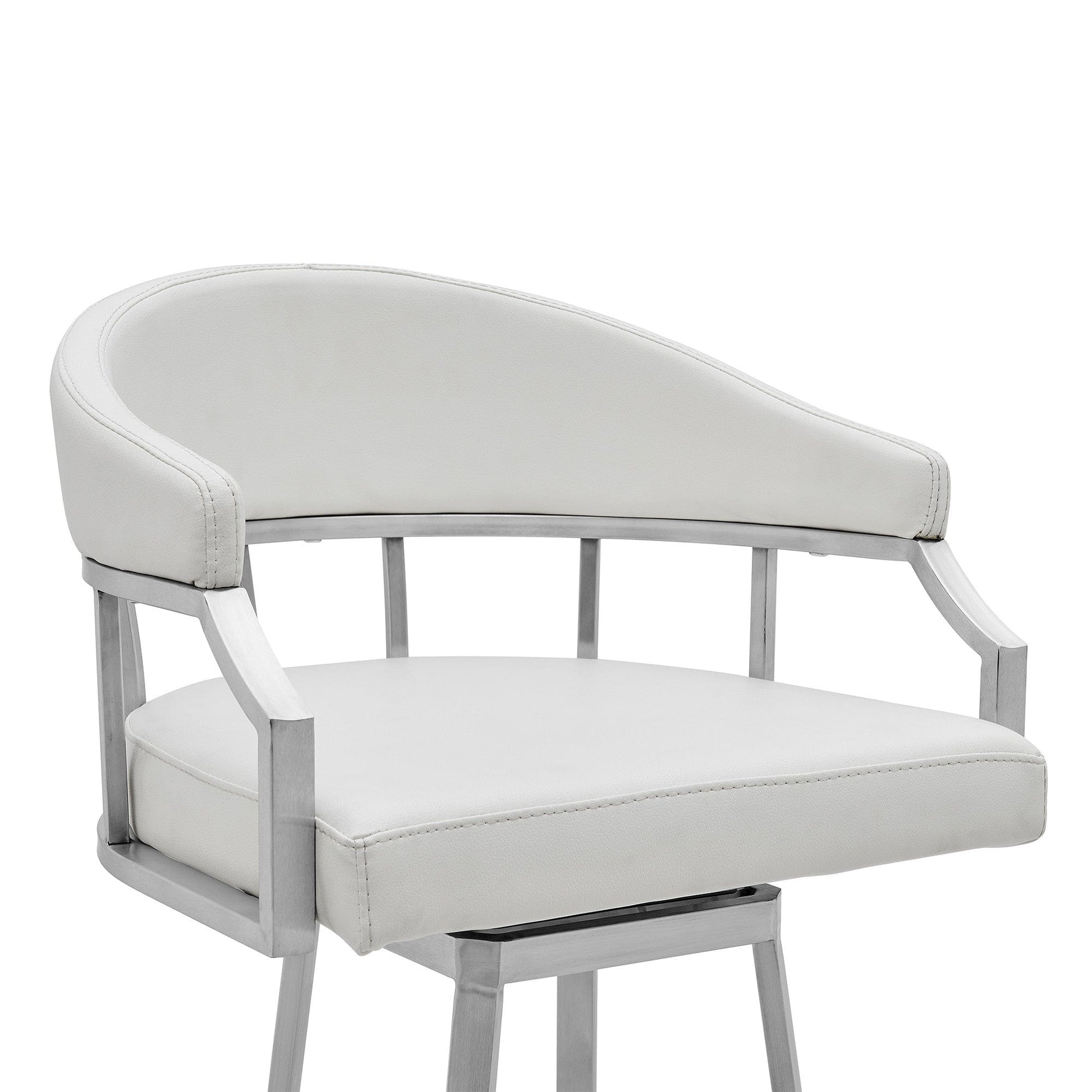 The perfect way to add some extra seating in your home, this 40" white faux leather and iron swivel low back bar height chair will elevate the look and vibe of your room. A brushed stainless steel finishing iron frame is finished off with a white faux leather seat that is the epitome of quality construction and design. A low back mixed with a round shaped seat design makes this chair both comfortable and fashionable. The armchair design gives you a great place to comfortably rest your arms. 40" H x 21" W x 21" D
