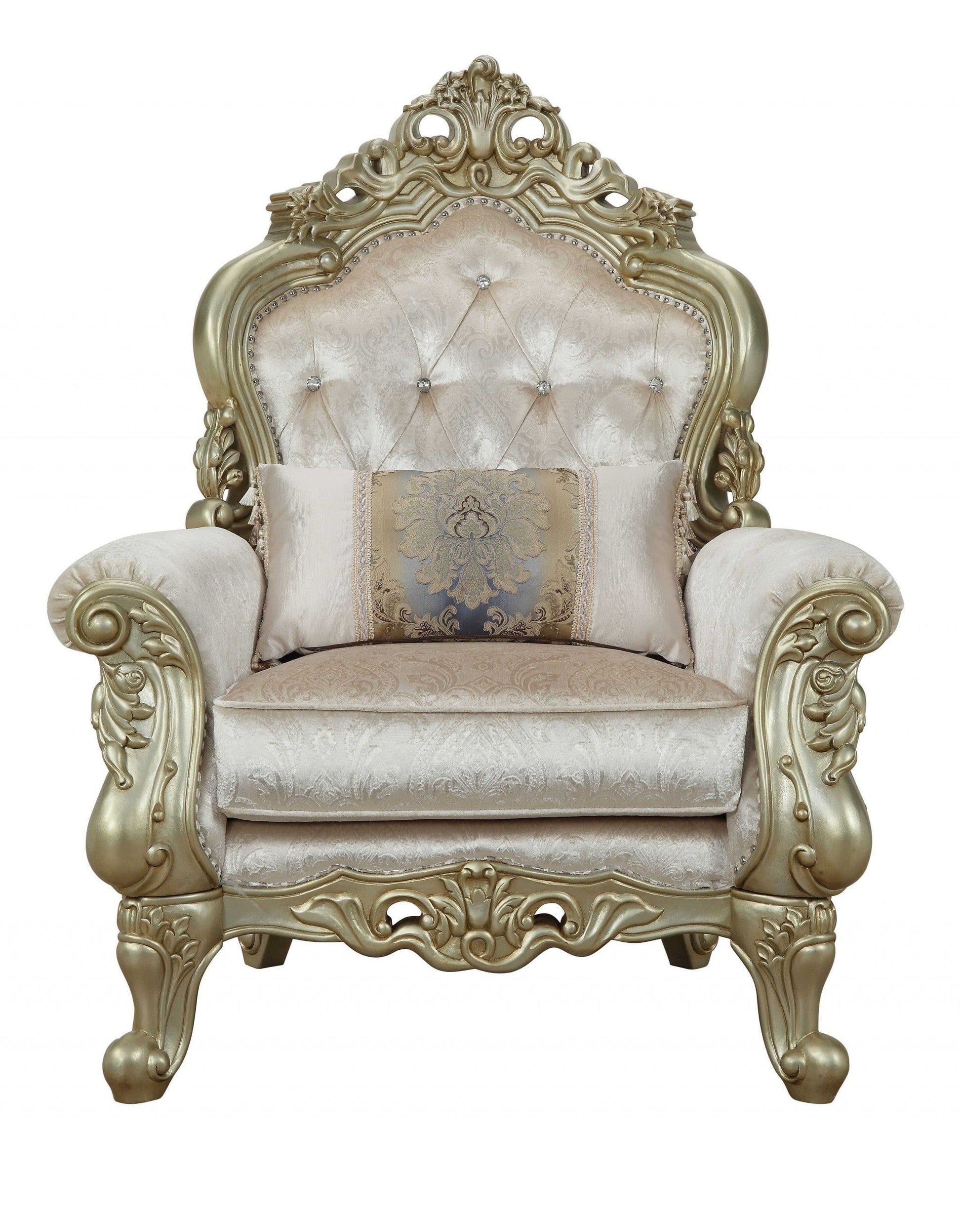 Exclusively designed and filled with romantic spirit, this beautiful chair features legs and carved aprons and trim, decorated with raised and scrolled floral motifs in an antique champagne finish. Each piece of this sophisticated living room set boasts of curved and rolled arms, oversized molding and crystal-like button tufted backrests with nailhead trim. This three piece collection with contrasting accent pillows will bring sophistication to your living room and will add elegance to any room decor.