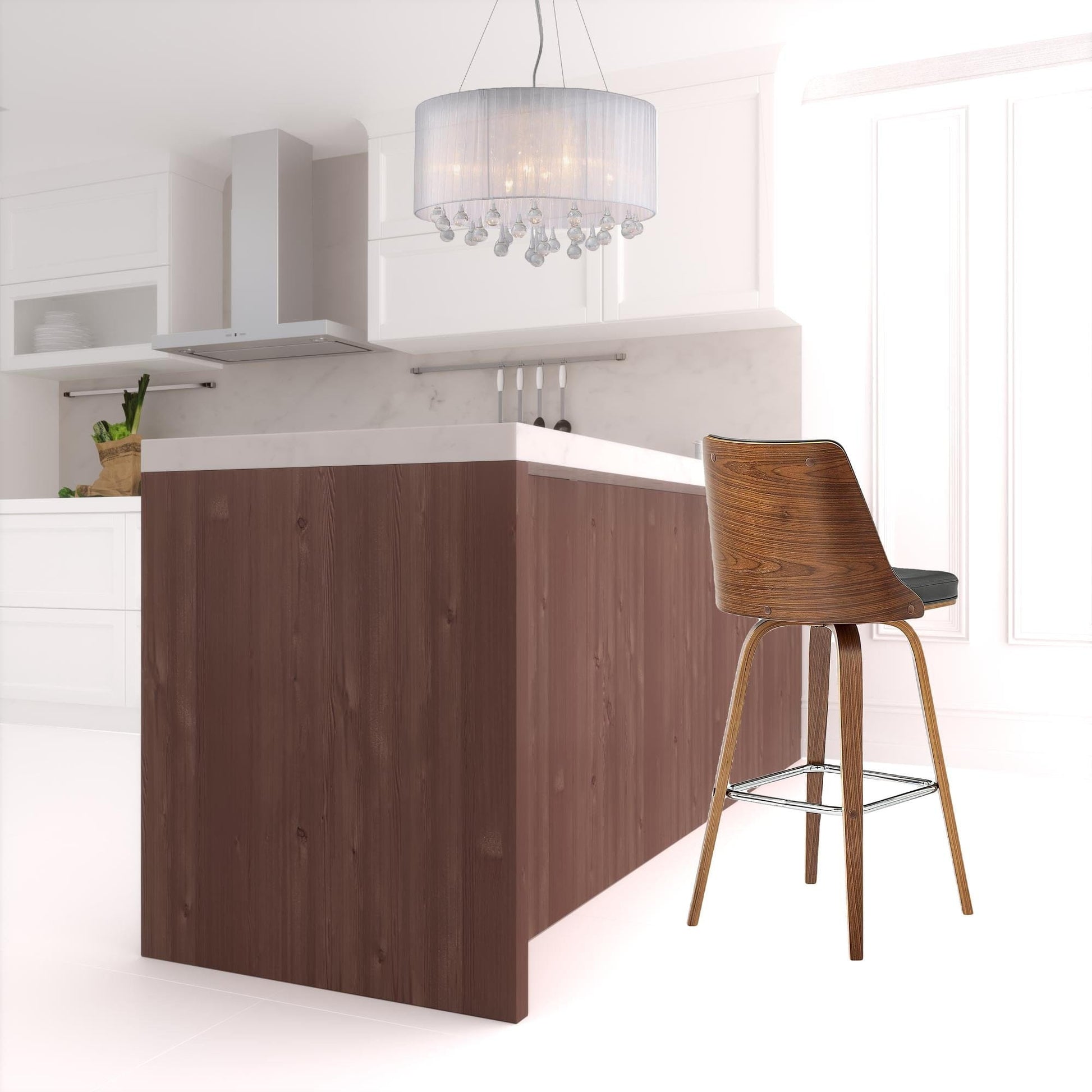 Bring a trendy bar vibe to your space, with this 41" gray faux leather and manufactured wood swivel bar height chair. A walnut manufactured wood frame is finished off with a gray faux leather seat that is the epitome of quality construction and design. A full back mixed with a round shaped seat design makes this chair both comfortable and fashionable. This stool will look great in your dining room, kitchen, bar, or recreation room. 41" H x 19" W x 20" D