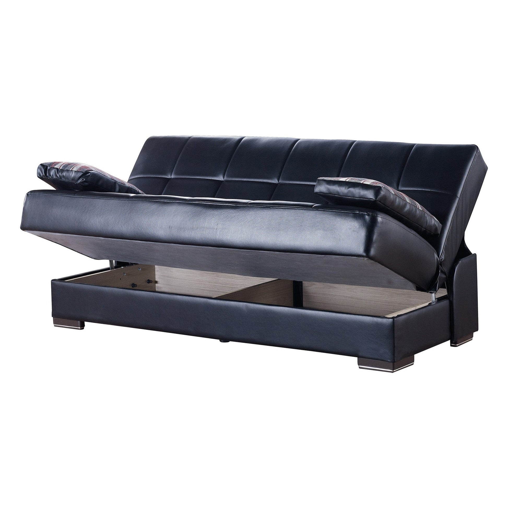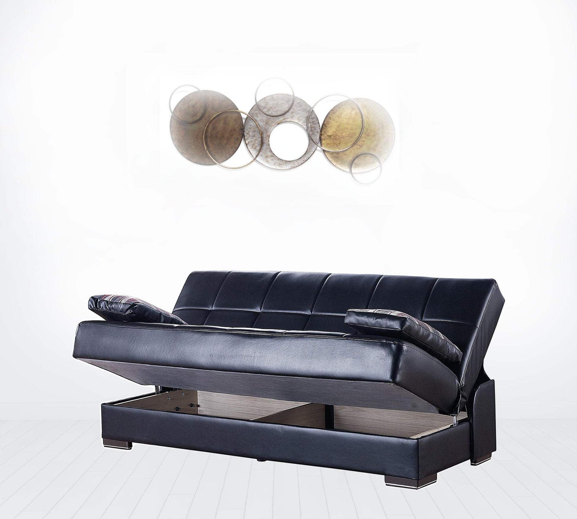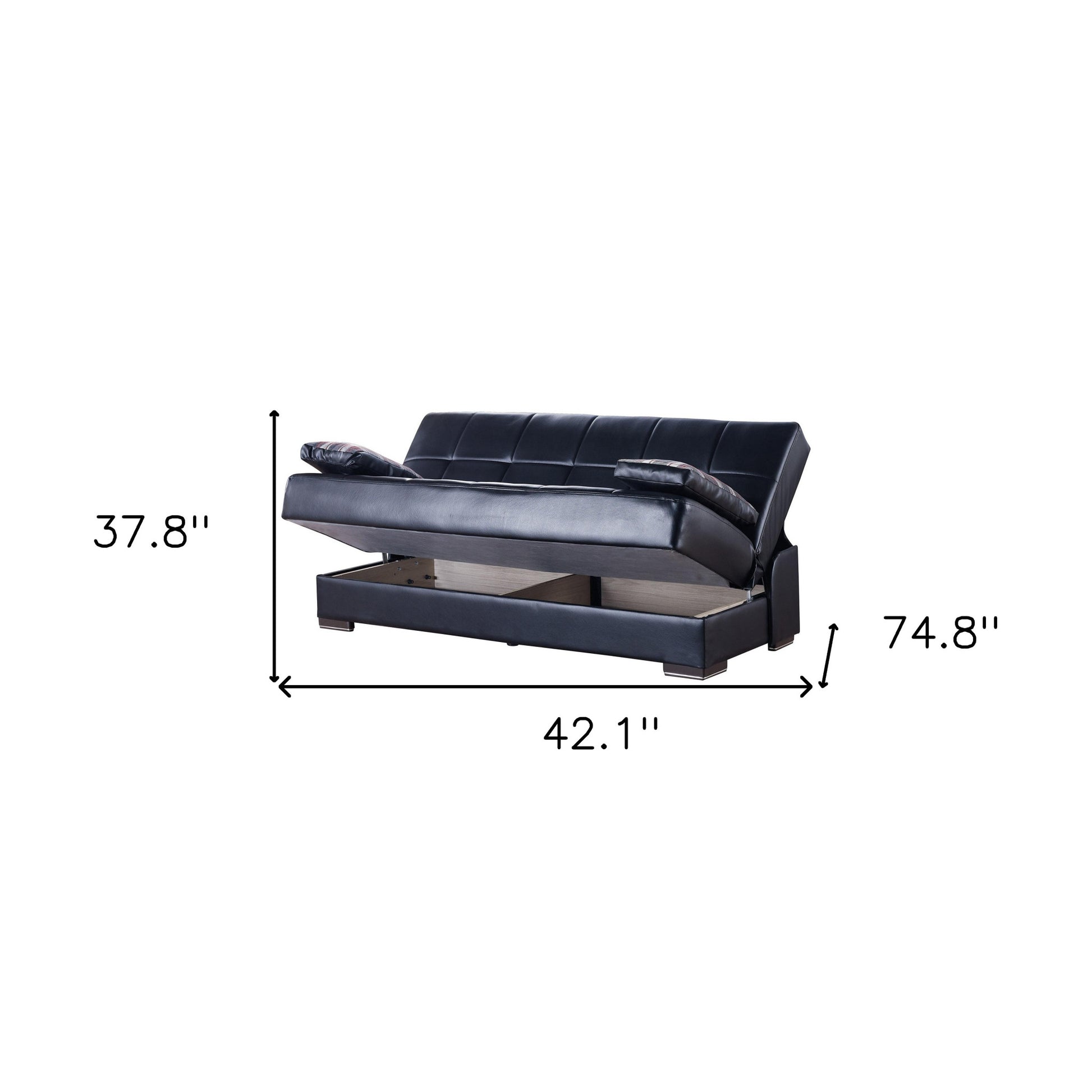 This 42" black faux leather and brown sleeper sofa with two toss pillows is made from sturdy and resilient faux leather that will look and feel like leather. Solid colors give you lots of decorative options and are easy to work into your decor scheme. Removable arms offer a comfy place to rest. Designed with an updated and refreshing style, this sofa is armless to create that unique contemporary or modern aesthetic. The tufted stitching pattern adds visual interest and fine designer detailing. Built to last, this sofa will be a great centerpiece for your room. 37.8" H x 42.1" W x 74.8" D