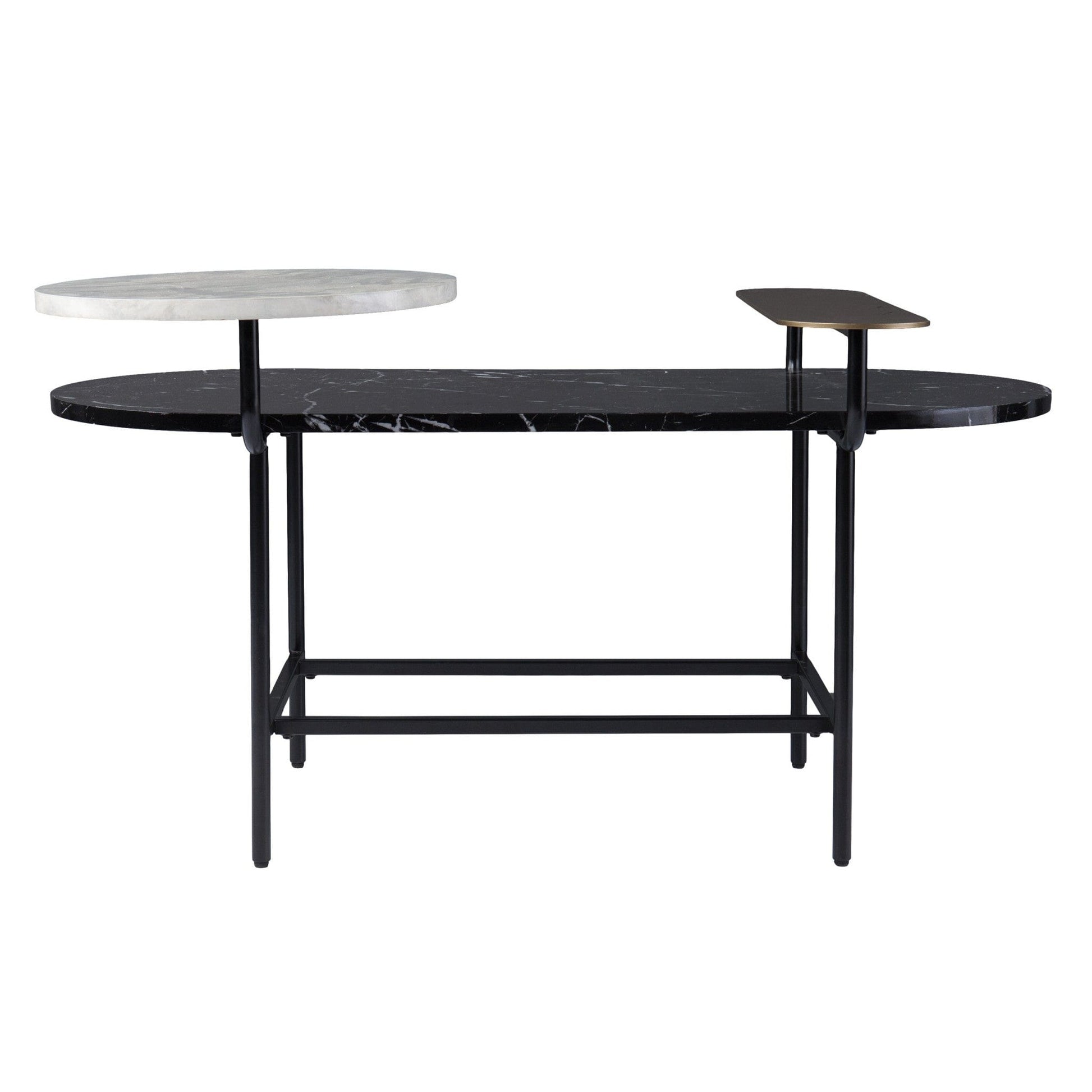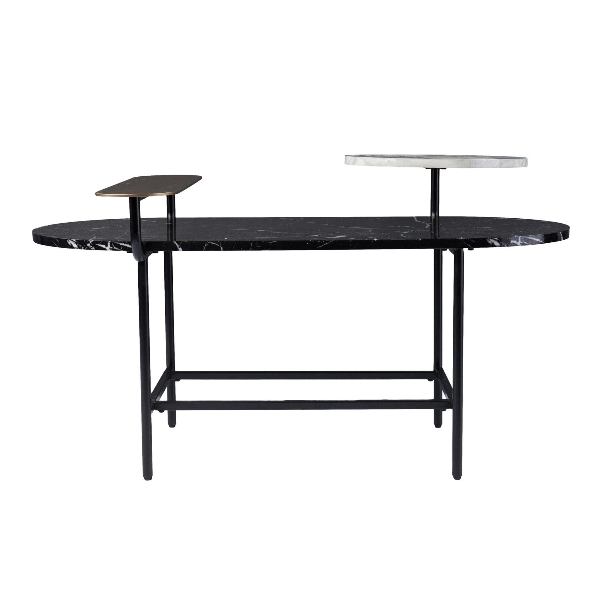 Make a statement with the 42" black manufactured wood and metal free form coffee table and infuse a dash of character and personality into your space. This multi-functional coffee table is built to last from high quality marble. A solid black metal frame is finished off with a matching black manufactured wood table, giving this table a chic monotone look. This free form table utilizes its unique shape to give your room a modern geometric accent. The black coloration throughout gives this piece an updated and refreshing look. It has a lovely design that will definitely breathe some fresh air into your interior. This coffee table is the sturdy, reliable and stylish answer to your living room needs. 23" H x 42" W x 30" D