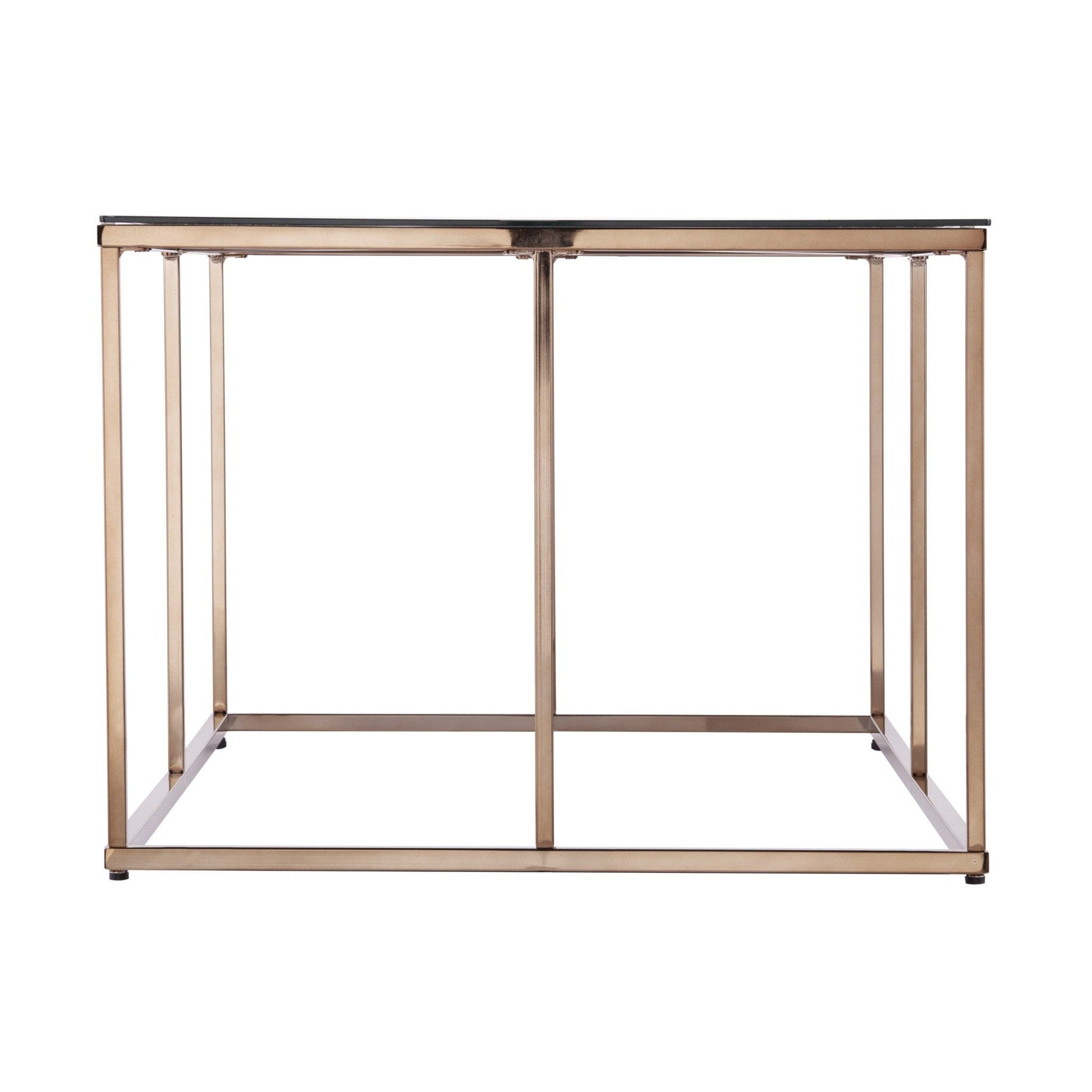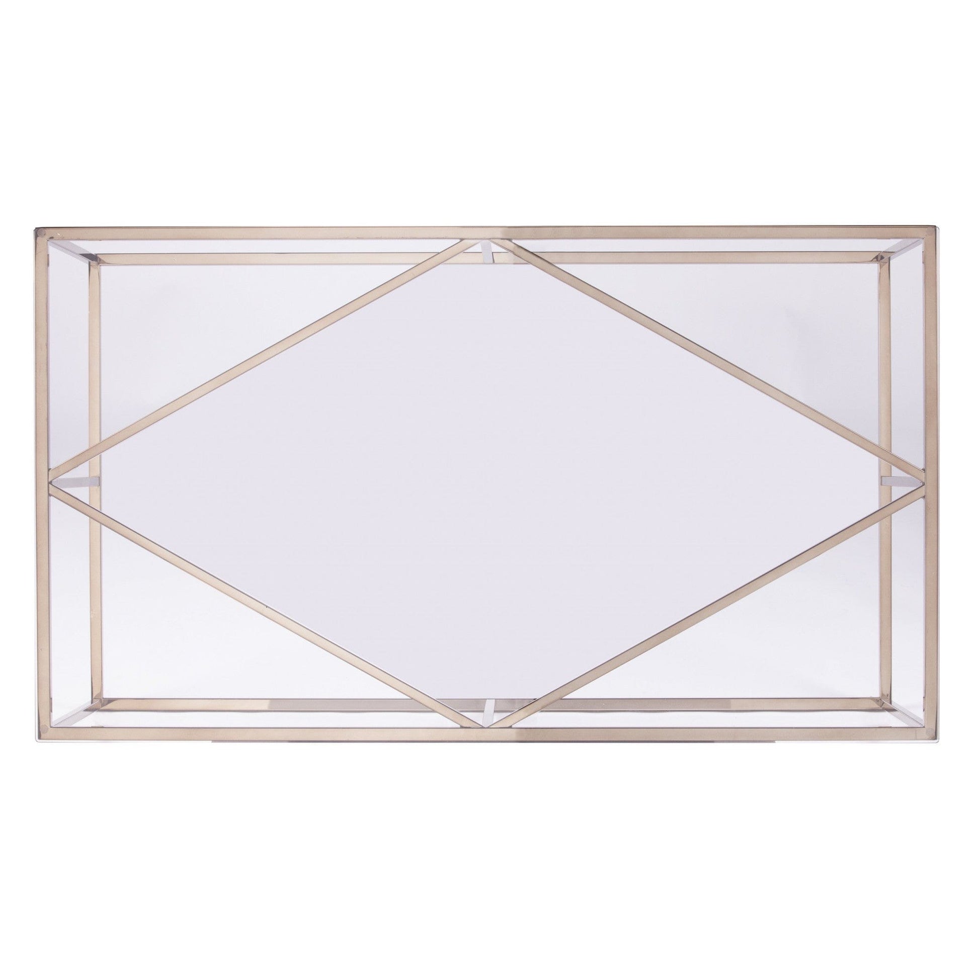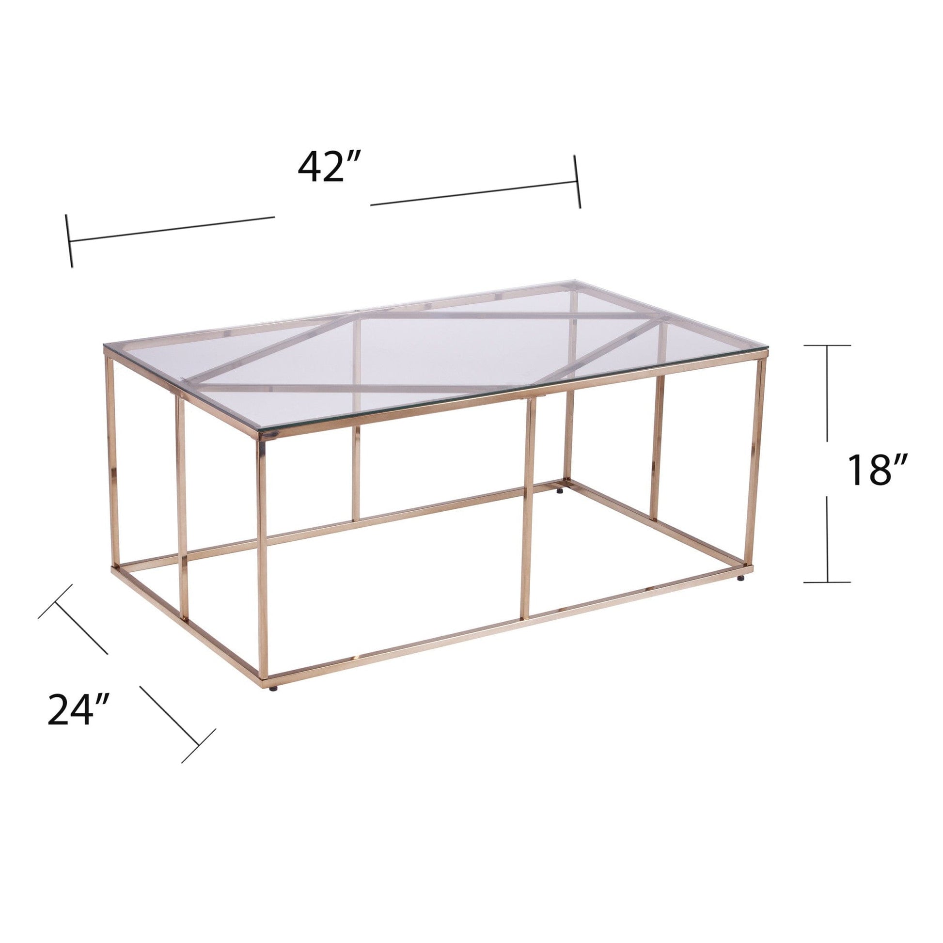 Give your living room, family room, or office the perfect anchor piece with this 42" champagne glass and metal rectangular coffee table. This coffee table is expertly made from high quality metal. A sleek champagne monotone color gives this metal and glass table a fresh and updated look. This rectangular table will be a great accent in any room This table features an updated monotone color scheme with champagne as the main color on both the top and the base. It has a lovely design that will definitely breathe some fresh air into your interior. This coffee table is the sturdy, reliable and stylish answer to your living room needs. 18" H x 42" W x 24" D