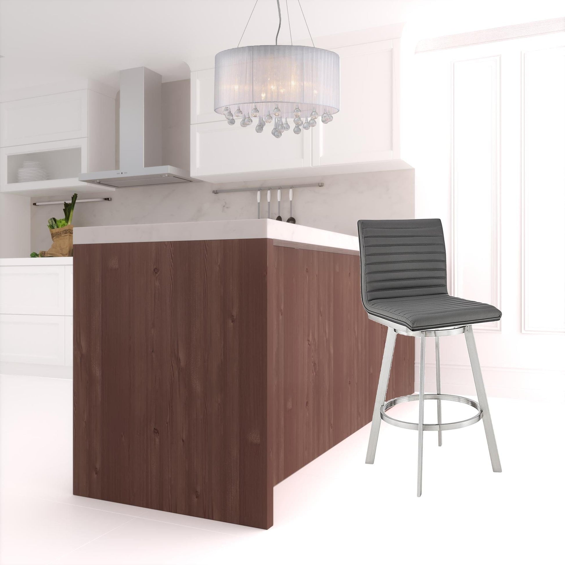 With this 42" gray faux leather and iron swivel bar height chair you can add design and extra seating to your space. The base of this stool is made from iron in a brushed stainless steel finishing color that is a nice contrast to the gray faux leather seat. A full back mixed with a round shaped seat design makes this chair both comfortable and fashionable. The armchair design gives you a great place to comfortably rest your arms. 42" H x 17" W x 21" D