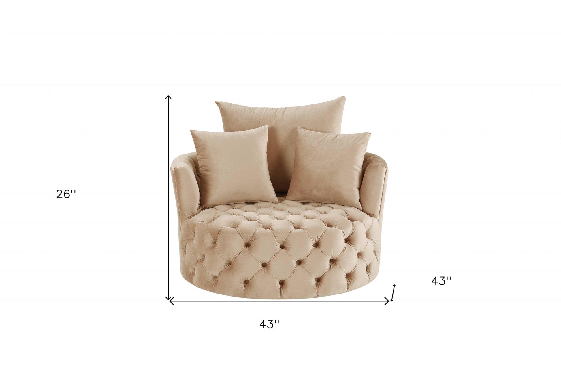 Add an air of fashion to your room and rejuivinate the space with this beige velvet barrel chair. This gorgeous solid color beige barrel chair is masterfully upholstered in durable velvet. The sturdy inner frame is built with high quality manufactured wood, includes armrests, and features a cushion back that is accented with soft and comfortable cushioning. The tufted cushions add fine designer detailing. A swivel feature allows this chair to turn, adding versatility to your seating. 26" H x 43" W x 43" D