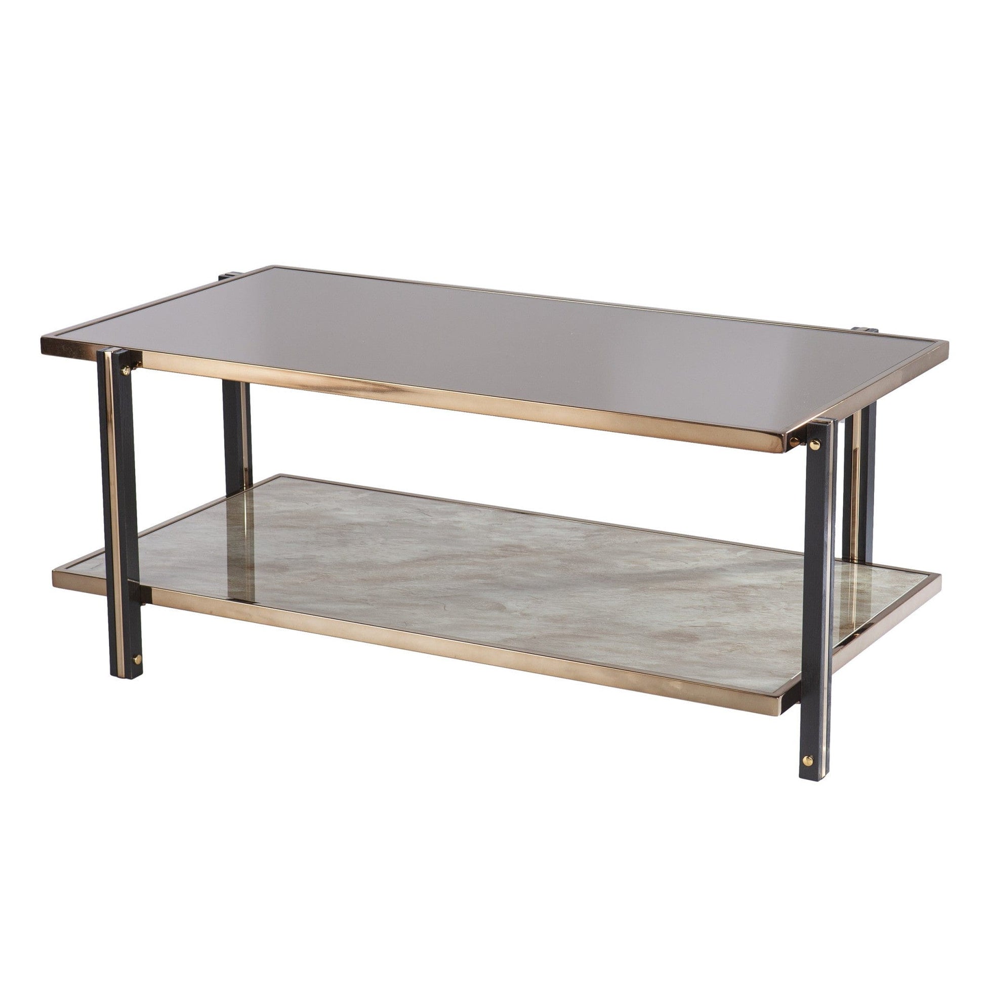 Stylish and super sturdy, the 43" champagne mirrored and metal rectangular mirrored coffee table is an amazingly good looking coffee table that will compliment your living room. This multi-functional coffee table is built to last from high quality metal. A sleek champagne monotone color gives this metal and mirrored table a fresh and updated look. Reflective pieces of mirrored glass give this table a glamorous and unique look. This rectangular table will be a great accent in any room This table features an updated monotone color scheme with champagne as the main color on both the top and the base. If you're looking for something that can fit both into a living area, bedroom, or office, this coffee table is for you. This coffee table is the sturdy, reliable and stylish answer to your living room needs. 18" H x 43" W x 23.25" D