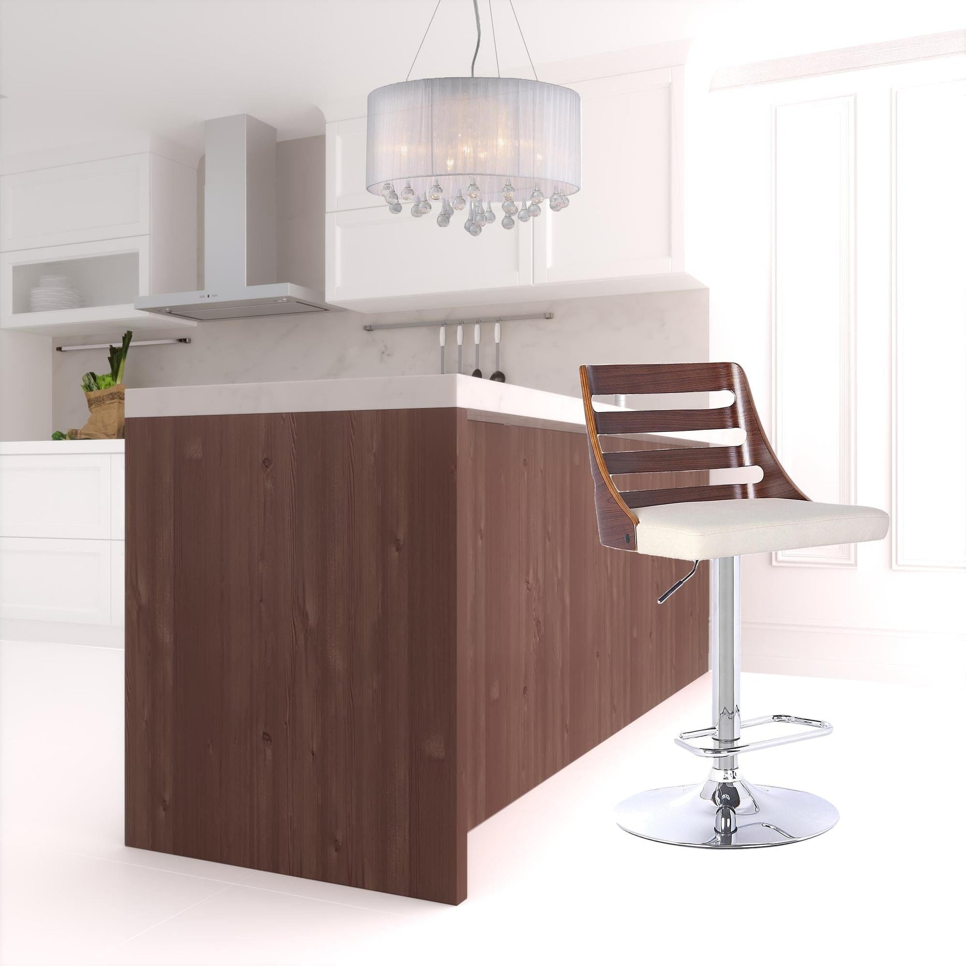 Comfort and design come together nicely in this 43" cream faux leather and iron adjustable height bar chair. The chrome and walnut coloration of the high quality iron base marries nicely with the cream faux leather seat. Not only good looking and stylish, this chair features a round shaped seat and a full back for the ultimate in comfort and enjoyment. This stool will look great in your dining room, kitchen, bar, or recreation room. 43" H x 18" W x 19" D