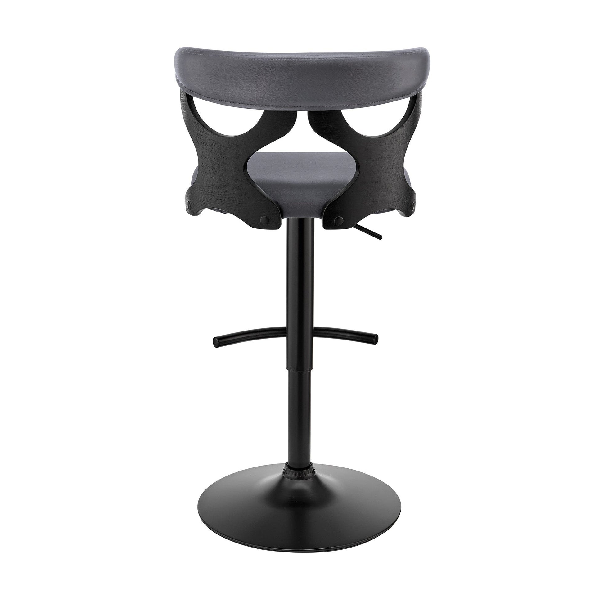 The perfect way to add some extra seating in your home, this 43" gray faux leather and iron swivel adjustable height bar chair will elevate the look and vibe of your room. A matte black iron frame is finished off with a gray faux leather seat that is the epitomy of quality construction and design. The round shape of the seat combines with a full back to give this chair a comfortable and fashionable look. A great seating option, this stool will bring a unique look to any room. 43" H x 20" W x 20" D