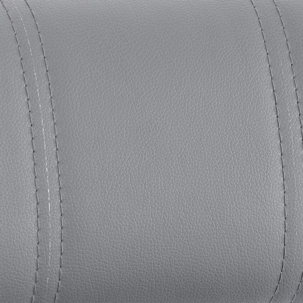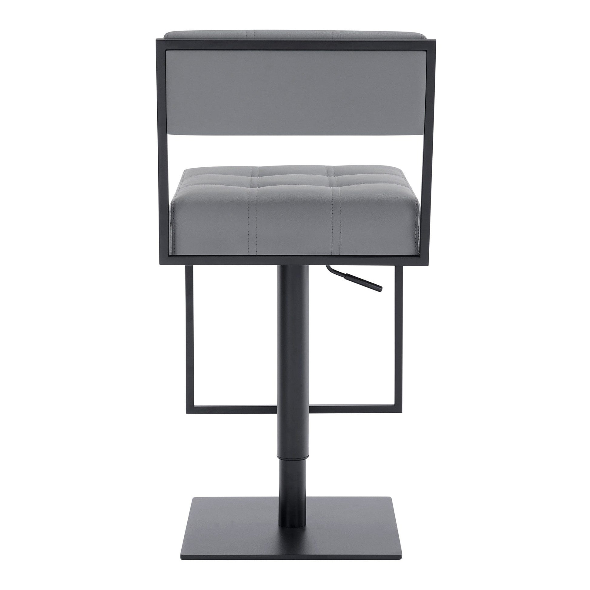 The perfect way to add some extra seating in your home, this 44" gray faux leather and iron swivel adjustable height bar chair will elevate the look and vibe of your room. The gray faux leather seat of this stool is a nice contrast to the high quality, matte black iron of the base. A full back mixed with a round shaped seat design makes this chair both comfortable and fashionable. A great seating option, this stool will bring a unique look to any room. 44" H x 17" W x 22" D