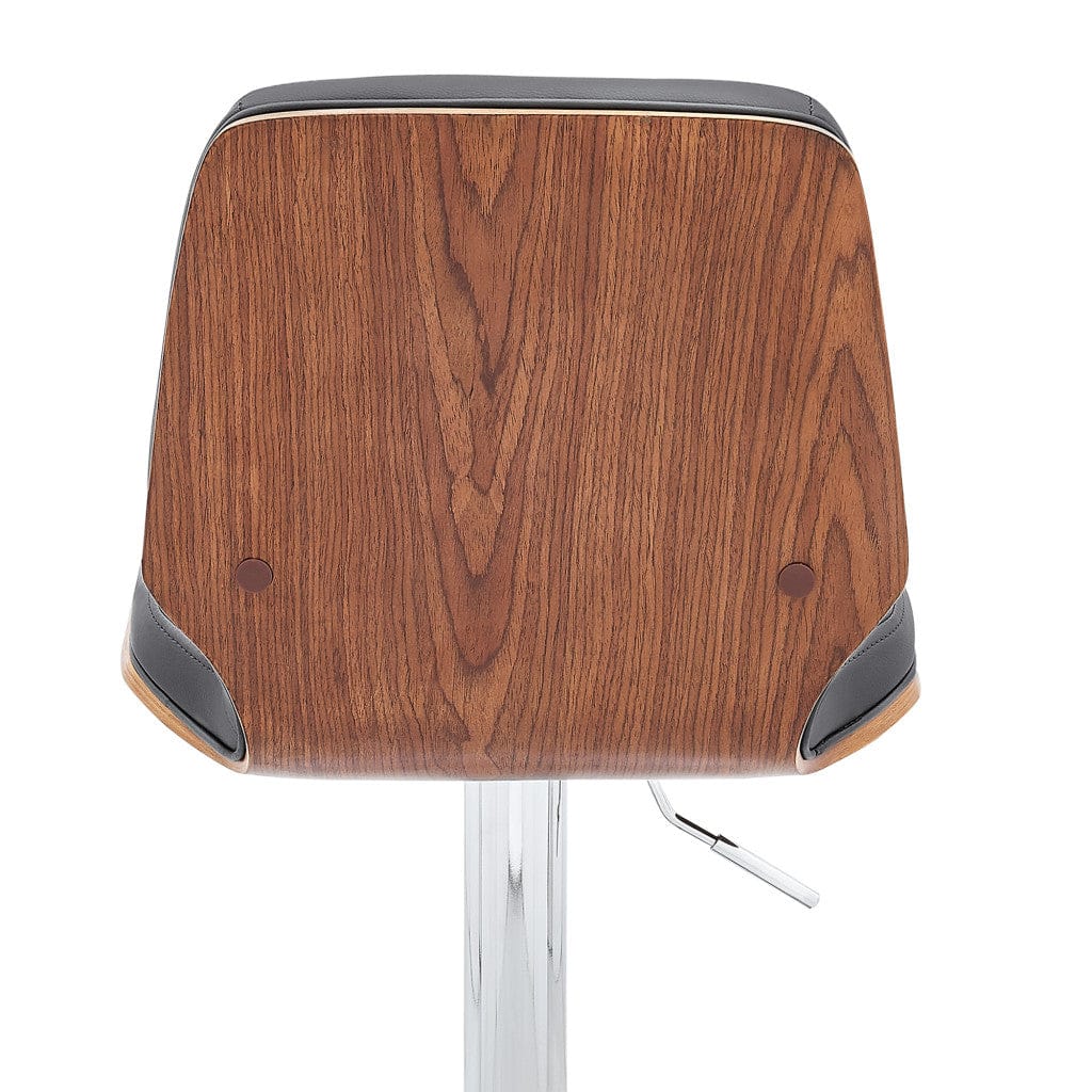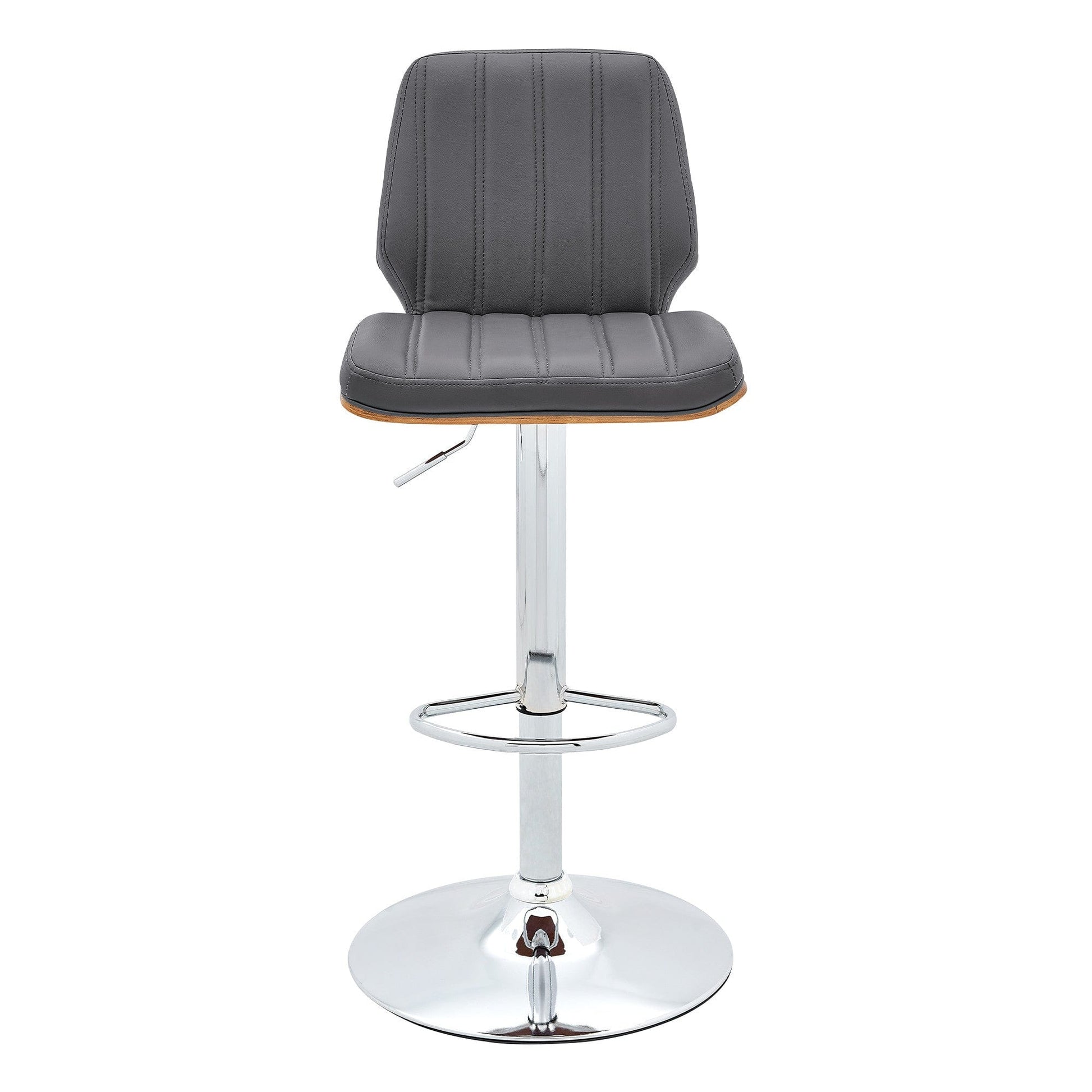 Comfortable enough to sit in for awhile, this 44" gray faux leather and manufactured wood swivel adjustable height bar chair will transcend the look of your room. The gray faux leather seat of this stool is a nice contrast to the high quality, walnut manufactured wood of the base. Not only good looking and stylish, this chair features a round shaped seat and a full back for the ultimate in comfort and enjoyment. A great seating option, this stool will bring a unique look to any room. 44" H x 17" W x 20" D