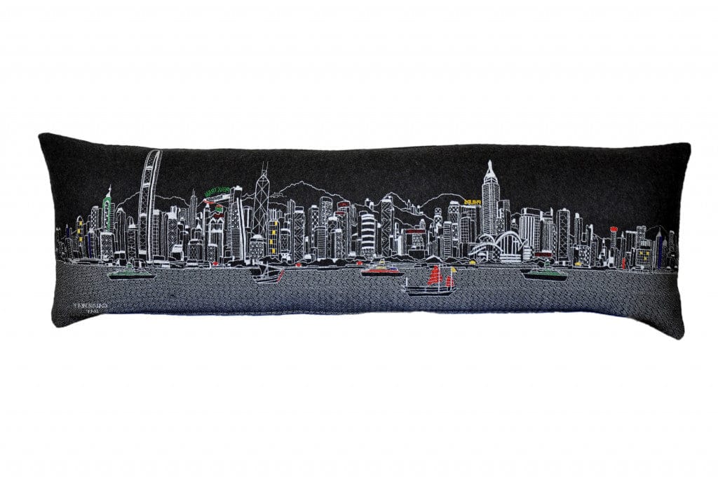 Showcase one of the most famous cities in the world with our Black Color Hong Kong Nighttime Skyline King Size Lumbar Decorative Pillow. This Nighttime view of Hong Kong from Causeway Bay, is a stunning way to represent one of the most important and travelled cities in the world. The gorgeous art features famous architecture and landmarks rendering a modern whimsical way to bring this iconic cityscape to life. Made of a wool/nylon blend, this high quality stitched decorative pillow features white on black embroidered artwork mixed with pops of color that highlight important and recognizable icons from this fabulous city. This pillow makes a great gift, decorative accent and conversation piece. 4" x 45" x 14"