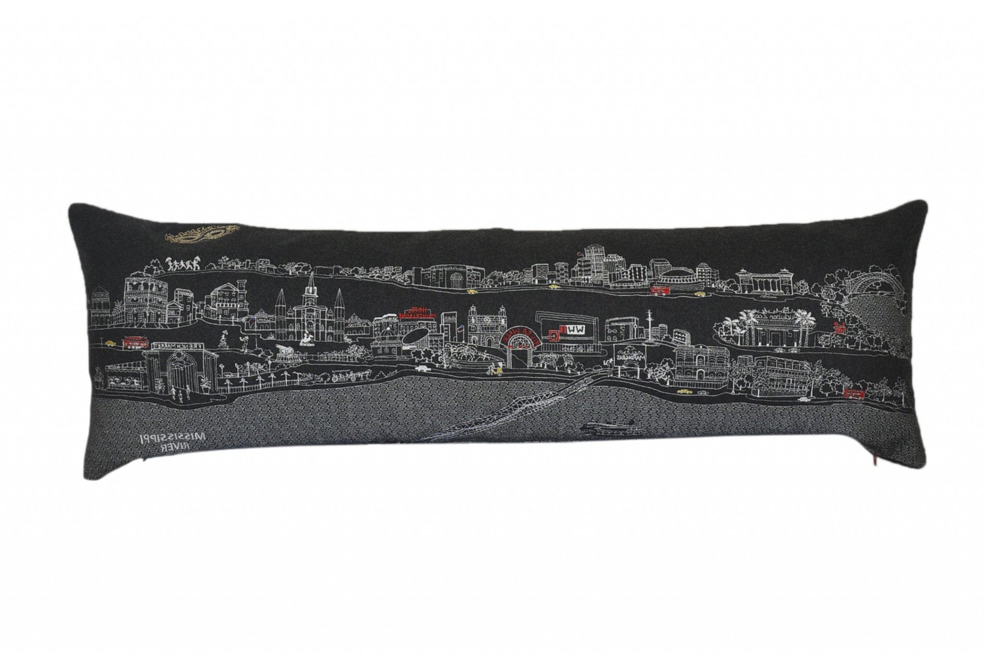 Showcase this famous city, with our Black Color New Orleans Nighttime Skyline King Size Lumbar Decorative Pillow. The Nighttime view of New Orleans from the Mississippi is picture perfect. The gorgeous art features many famous landmarks and references for this city famous for it's Jazz and Food, rendering a modern whimsical way to bring this iconic cityscape to life. Made of a wool/nylon blend, this high quality stitched decorative pillow features white on black embroidered artwork mixed with pops of color that highlight important and recognizable icons from this historical and fun city. This pillow makes a great gift, decorative accent and conversation piece. 4" x 45" x 14"