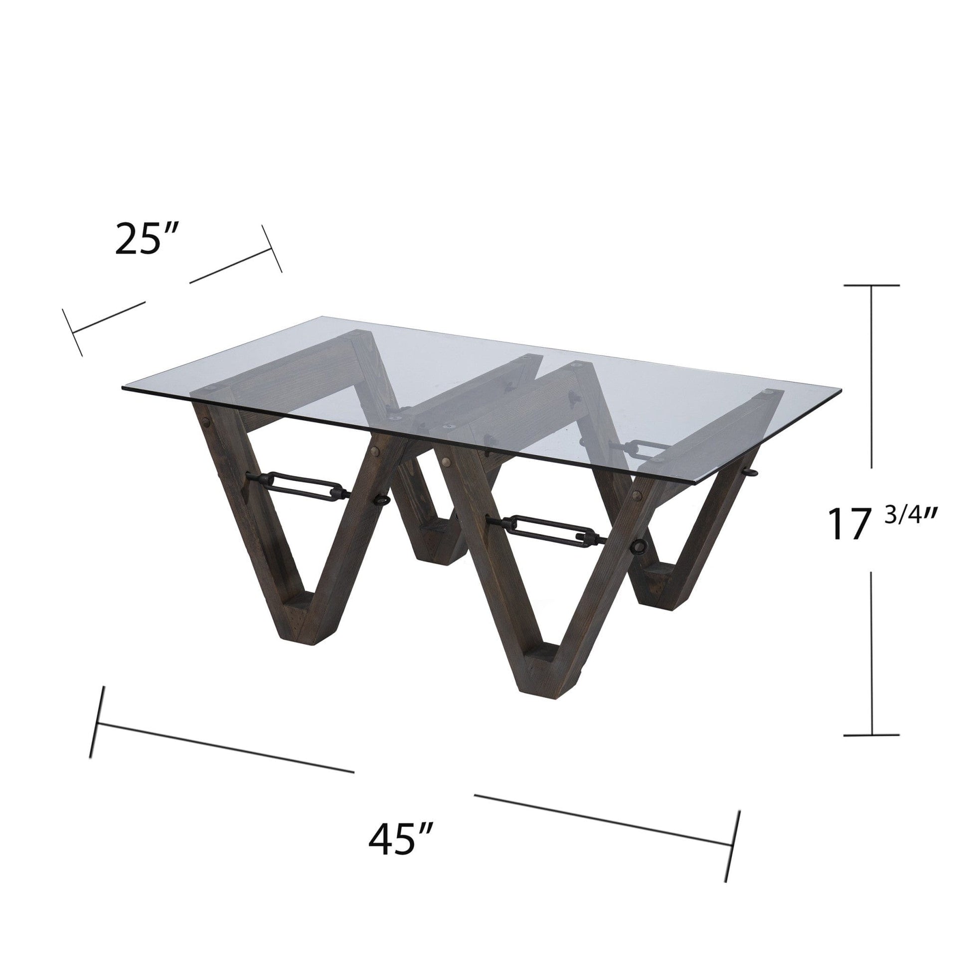 Make a statement with the 45" brown glass and solid wood rectangular coffee table and infuse a dash of character and personality into your space. This marvelous coffee table is made from high quality manufactured wood. The brown coloration runs throughout this good looking solid wood and glass table. This rectangular table is an updated take on a classic. The brown coloration throughout gives this piece an updated and refreshing look. If you're looking for something that can fit both into a living area, bedroom, or office, this coffee table is for you. This coffee table is the sturdy, reliable and stylish answer to your living room needs. 17.75" H x 45" W x 25" D