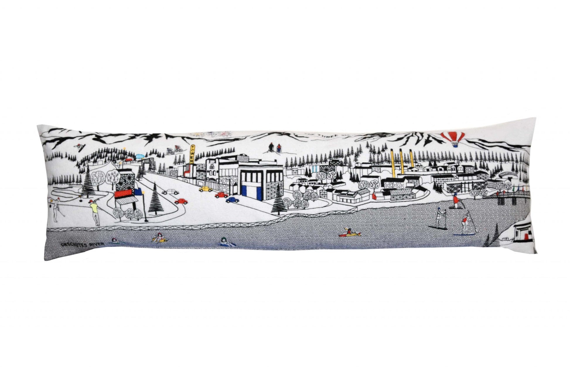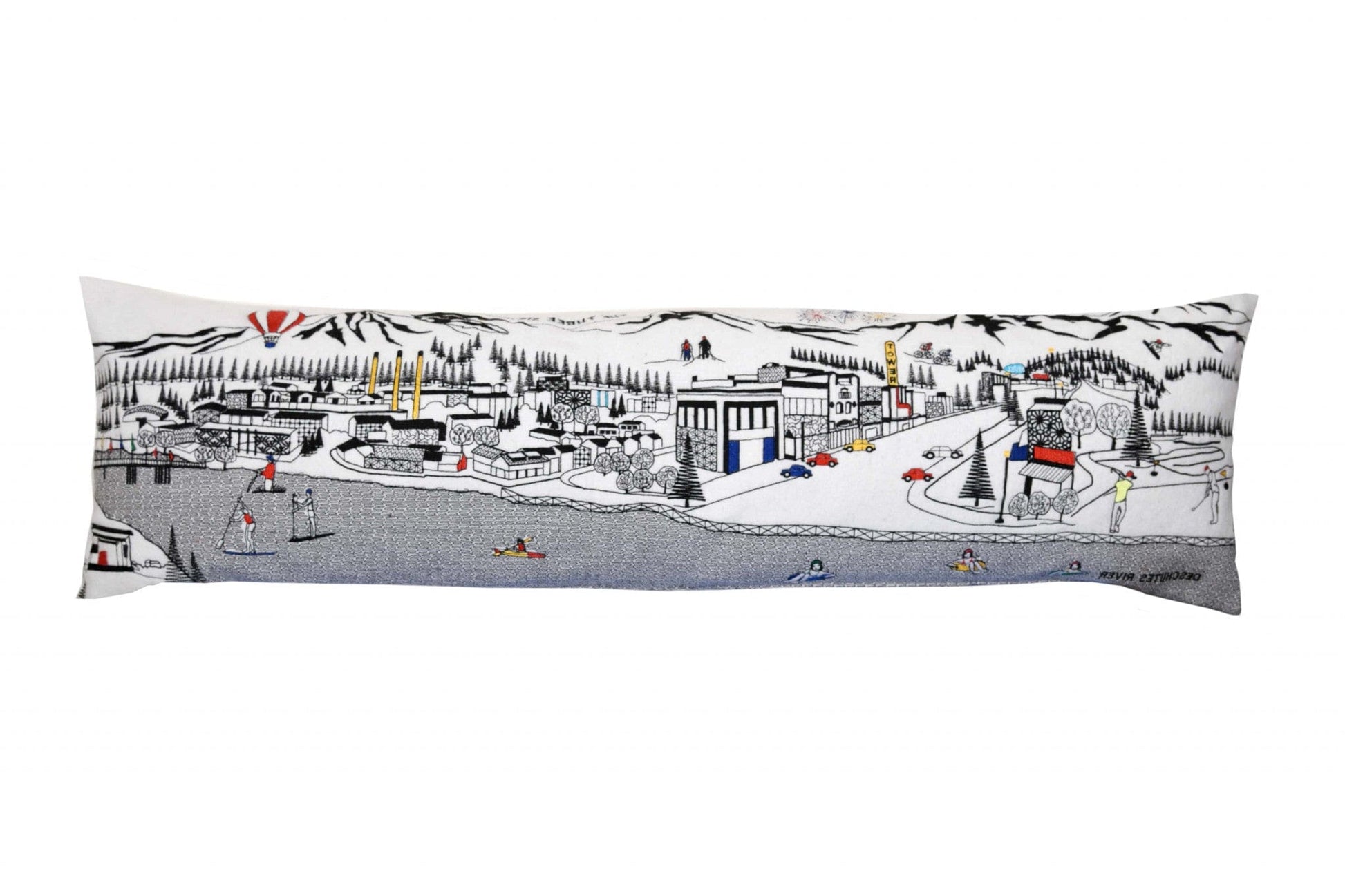 Showcase this famous city, with our Cream Color Bend Daylight Skyline King Size Lumbar Decorative Pillow. The daylight view of Bend from the mighty Deschutes River that runs through it, is picture perfect. The gorgeous art features many famous landmarks and references for this destination city, rendering a modern whimsical way to bring this iconic cityscape to life. Made of a wool/nylon blend, this high quality stitched decorative pillow features black on white embroidered artwork mixed with pops of color that highlight important and recognizable icons from this popular Oregon city. This pillow makes a great gift, decorative accent and conversation piece. 4" x 45" x 14"