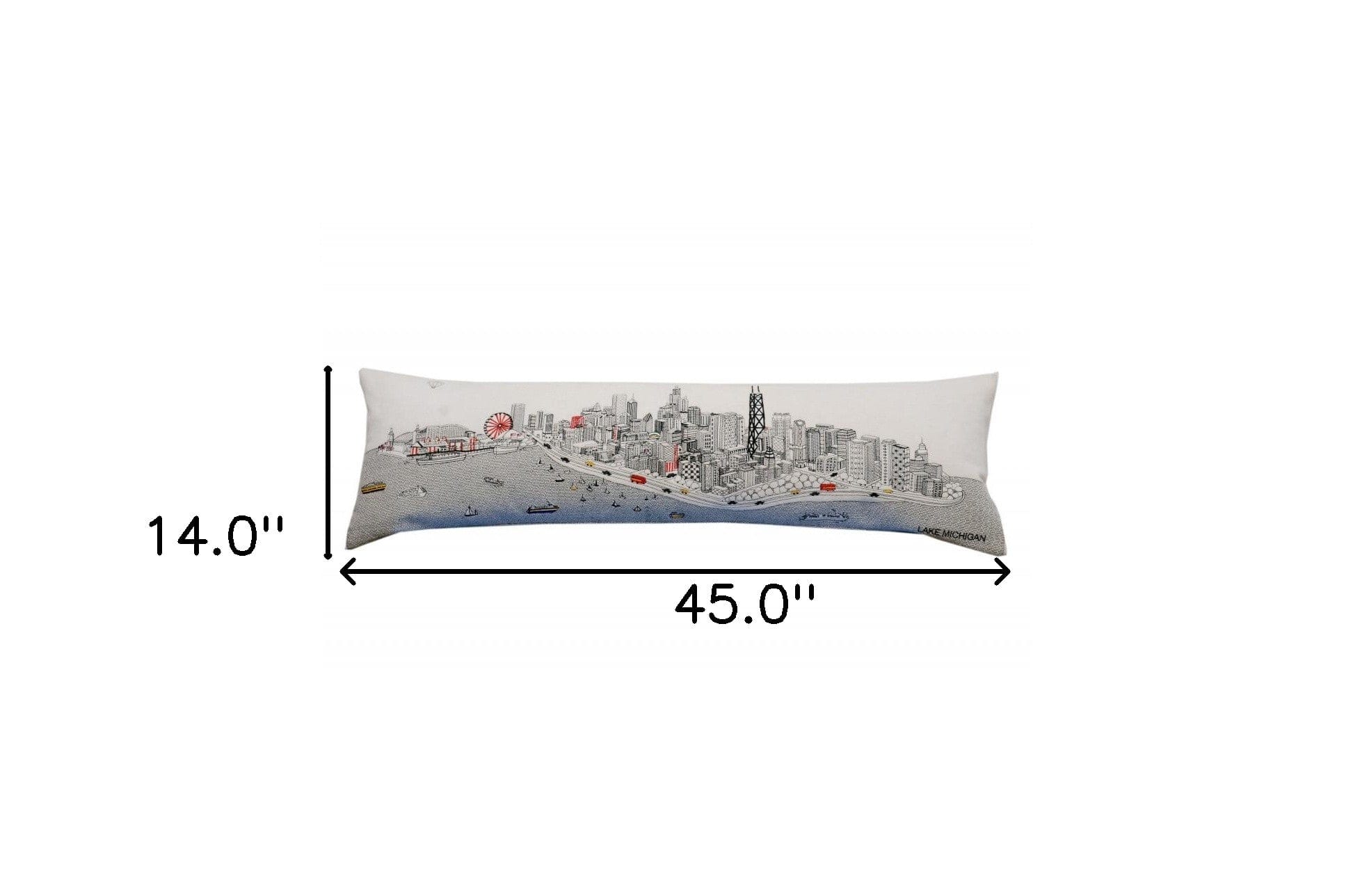 Showcase one of the most famous cities in the world with our Cream Color Chicago Daylight Skyline King Size Lumbar Decorative Pillow. This daylight view of Chicago from Lake Michigan is a stunning way to represent one of the most beloved cities. Known for it's jazz and considered the birthplace of skyscrapers, the gorgeous art features famous architecture and landmarks rendering a modern whimsical way to bring this iconic cityscape to life. Made of a wool/nylon blend, this high quality stitched decorative pillow features black on white embroidered artwork mixed with pops of color that highlight important and recognizable icons from this fabulous city. This pillow makes a great gift, decorative accent and conversation piece. 4" x 45" x 14"
