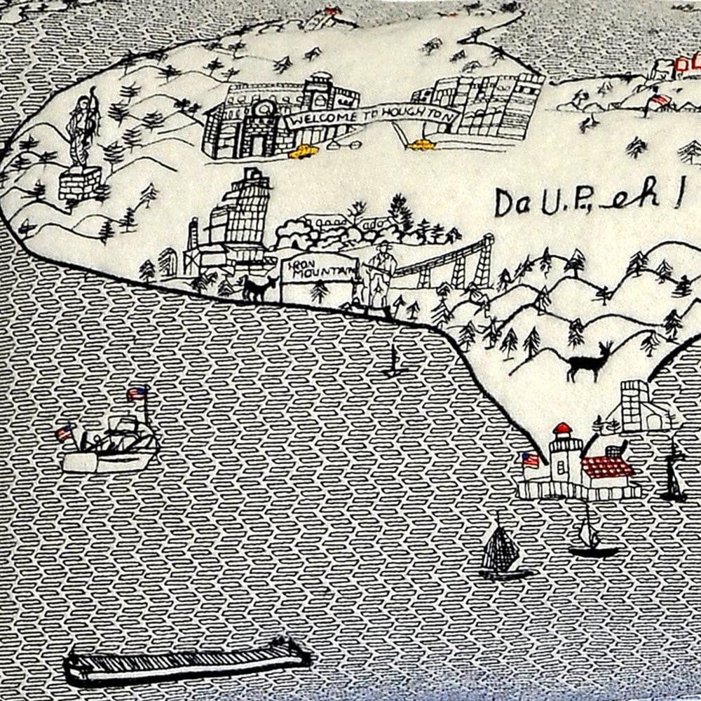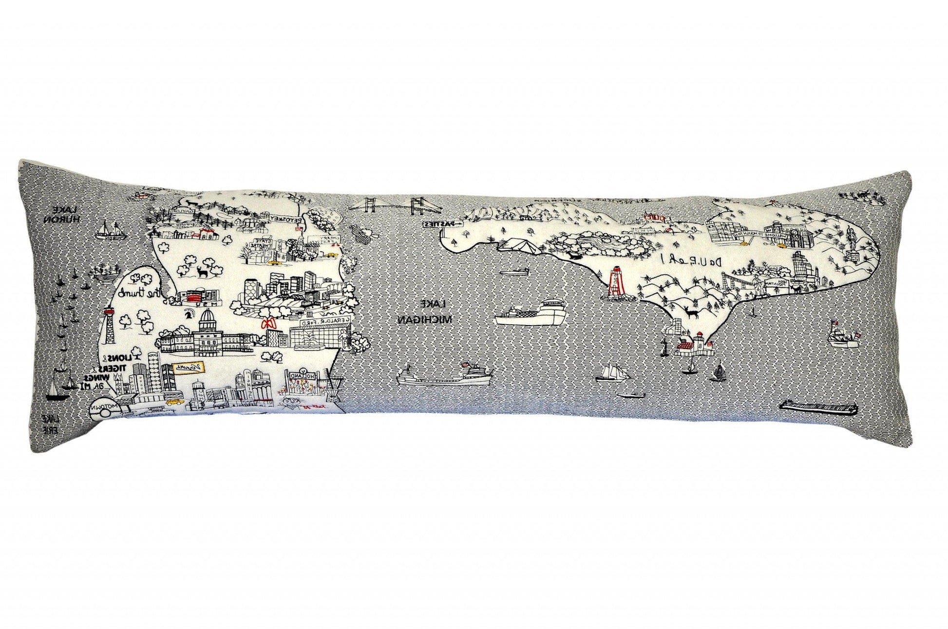 Showcase one of the greatest and most beloved states, with our Cream Color Michigan Daylight Skyline King Size Lumbar Decorative Pillow. This daylight view of the wonderful mitten and Upper Peninsula surrounded by their famous lakes is a stunning way to represent this great state. The gorgeous art features famous references and landmarks rendering a modern whimsical way to bring this iconic state to life. Made of a wool/nylon blend, this high quality stitched decorative pillow features black on white embroidered artwork mixed with pops of color that highlight important and recognizable icons from this fabulous city. This pillow makes a great gift, decorative accent and conversation piece. 4" x 45" x 14"
