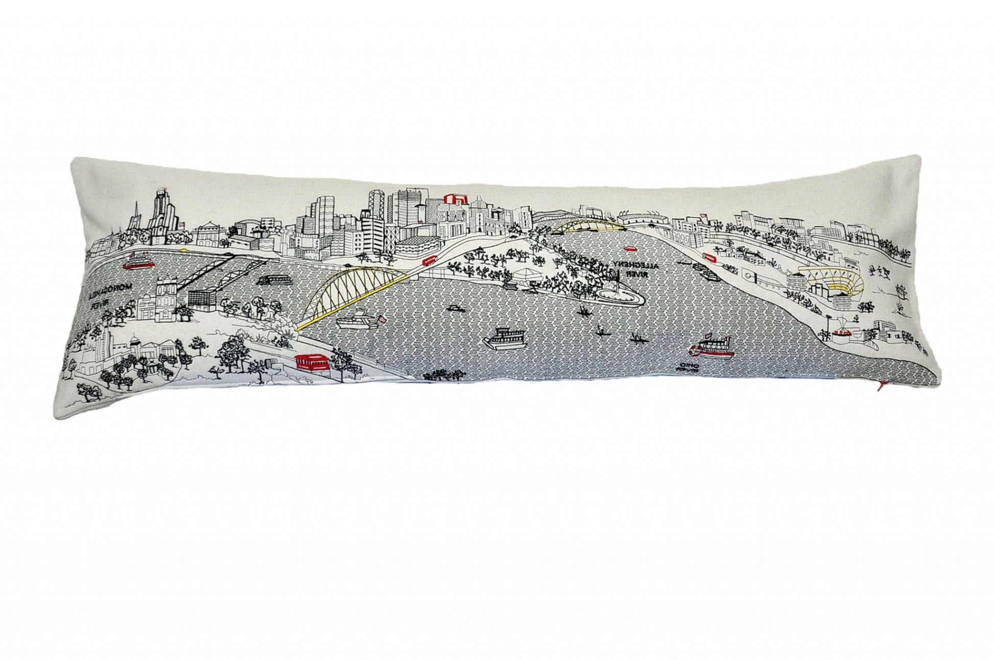 Showcase this famous city, with our Cream Color Pittsburgh Daylight Skyline King Size Lumbar Decorative Pillow. The daylight view of the Pittsburgh with its famous rivers is picture perfect. The gorgeous art features many famous landmarks and references for this revered city, rendering a modern whimsical way to bring this iconic cityscape to life. Made of a wool/nylon blend, this high quality stitched decorative pillow features black on white embroidered artwork mixed with pops of color that highlight important and recognizable icons from this fabulous city. This pillow makes a great gift, decorative accent and conversation piece. 4" x 45" x 14"