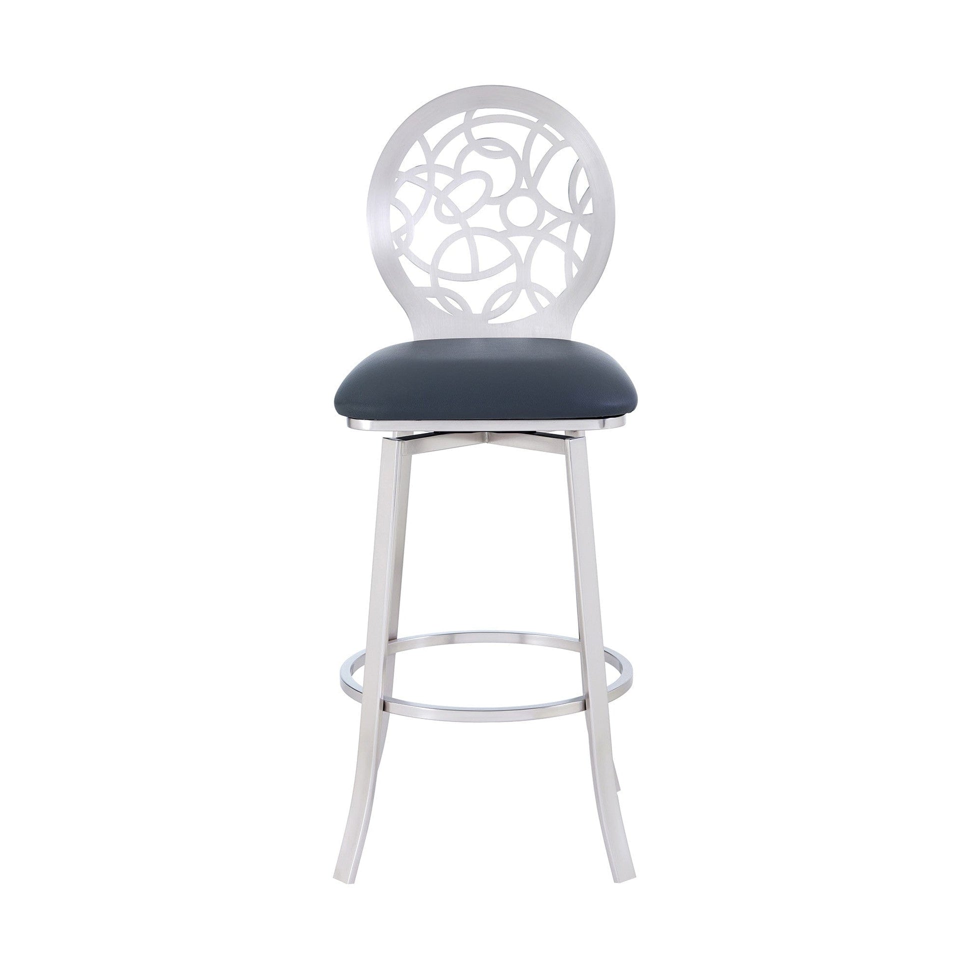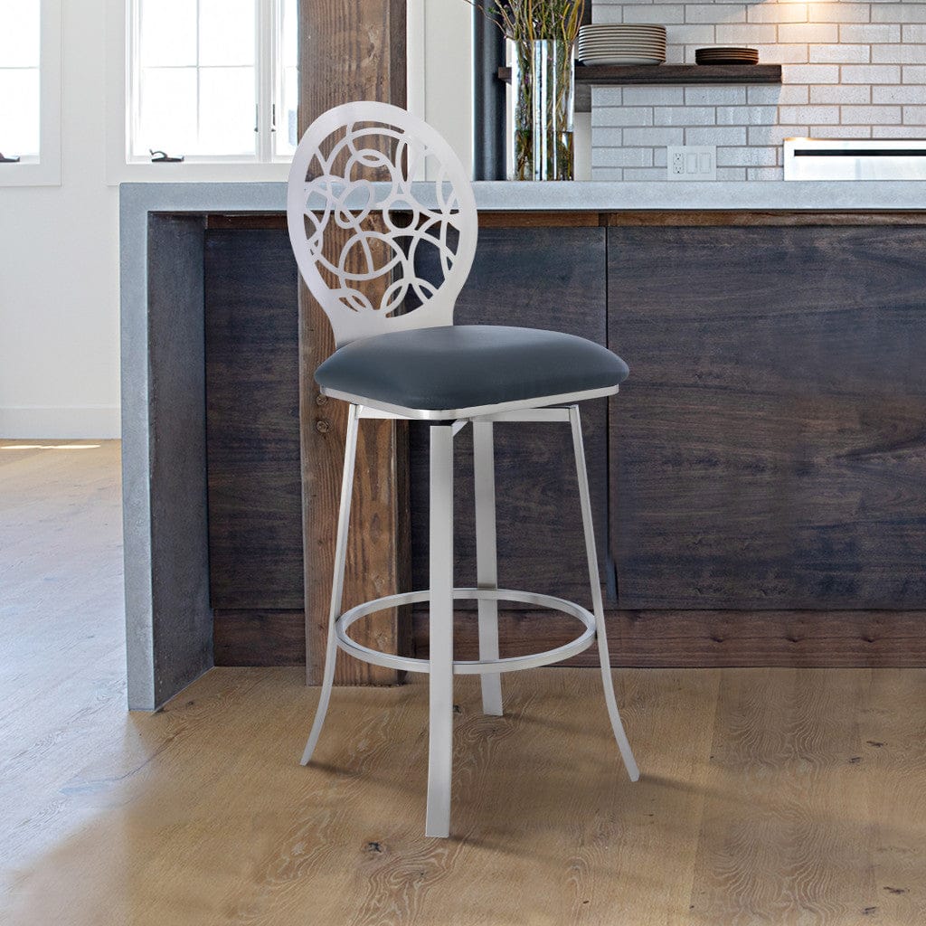 This 46" gray faux leather and iron swivel bar height chair will be the perfect way to add some cool design and utility to your space similar to what you find in your favorite cafes or pubs. A brushed stainless steel iron frame is finished off with a gray faux leather seat that is the epitome of quality construction and design. Not only good looking and stylish, this chair features a round shaped seat and a full back for the ultimate in comfort and enjoyment. This stool will look great in your dining room, kitchen, bar, or recreation room. 46" H x 21" W x 18" D