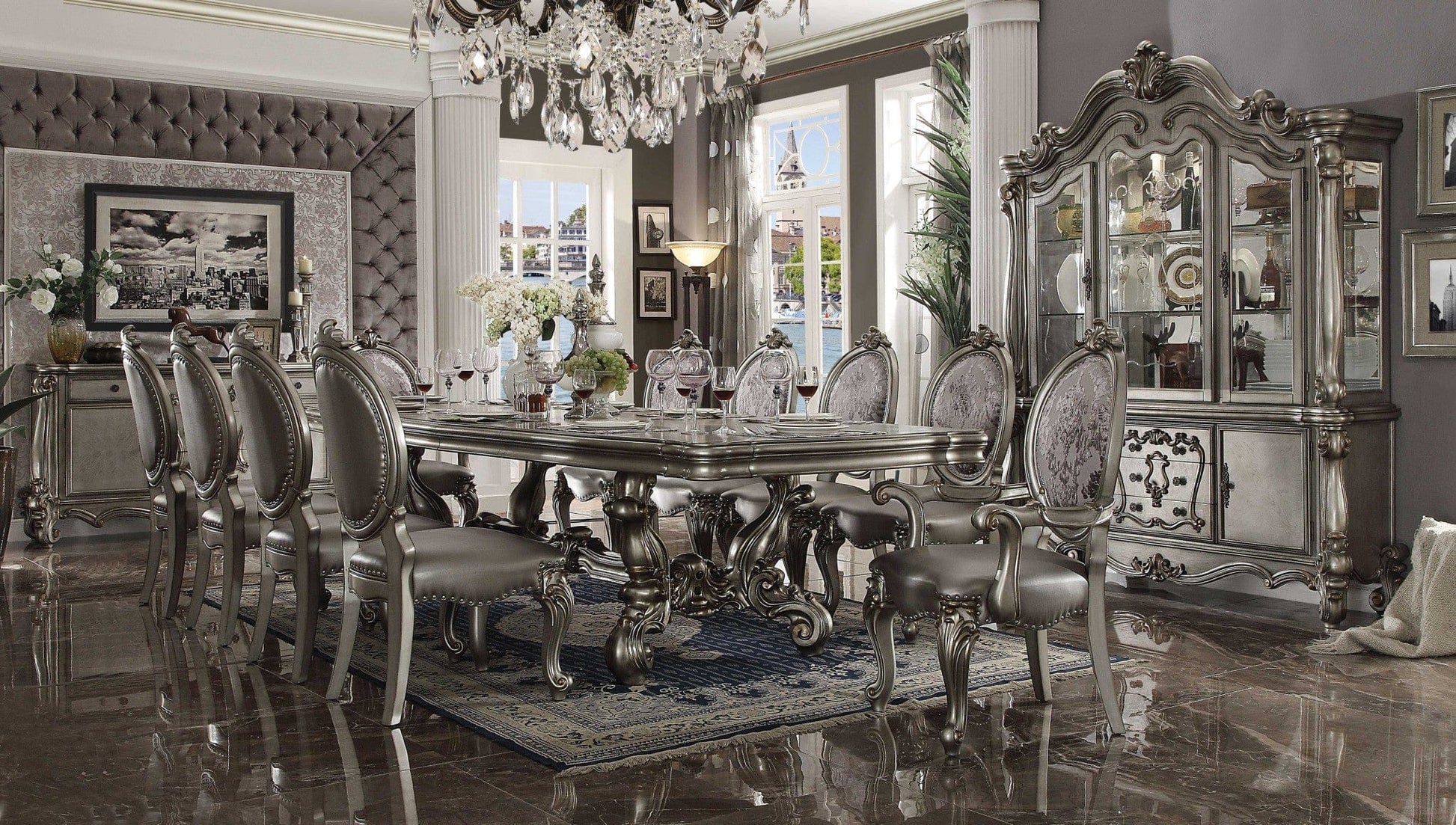stunning is an understatement for this dining room collection! this dining table highlights a remarkable traditional design which will blend with most home decor themes. it is expertly carved from solid pieces of wood and poly resin. the beauty of this table is further amplified by a decorative base and oversized scrolled feet covered with decorative carvings. complementing the table are matching chairs, fully upholstered and tapestried. these chairs also feature stunning nailhead trim and exquisite detailing. the collection presents three table and finishing styles that can bring a touch of classiness to your home. it is rugged and will be usable for a long time. it is finished in a captivating antique platinum veneer. available in the size of 46 by 120 by 32 inches