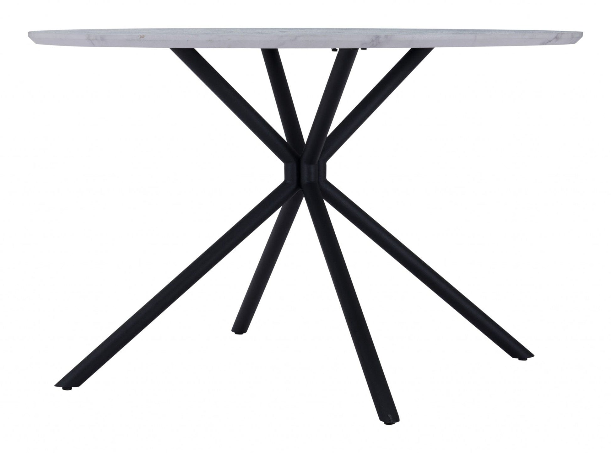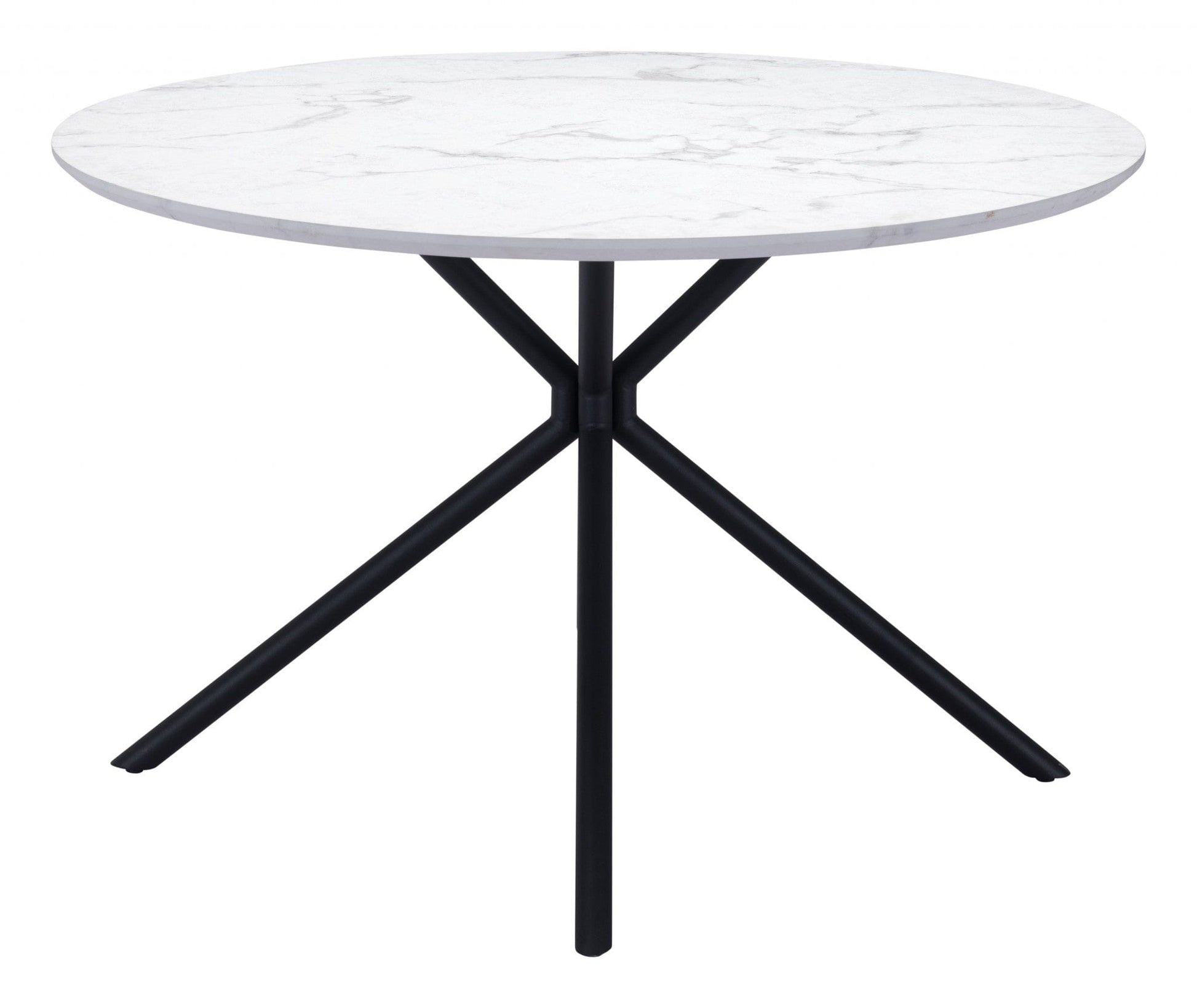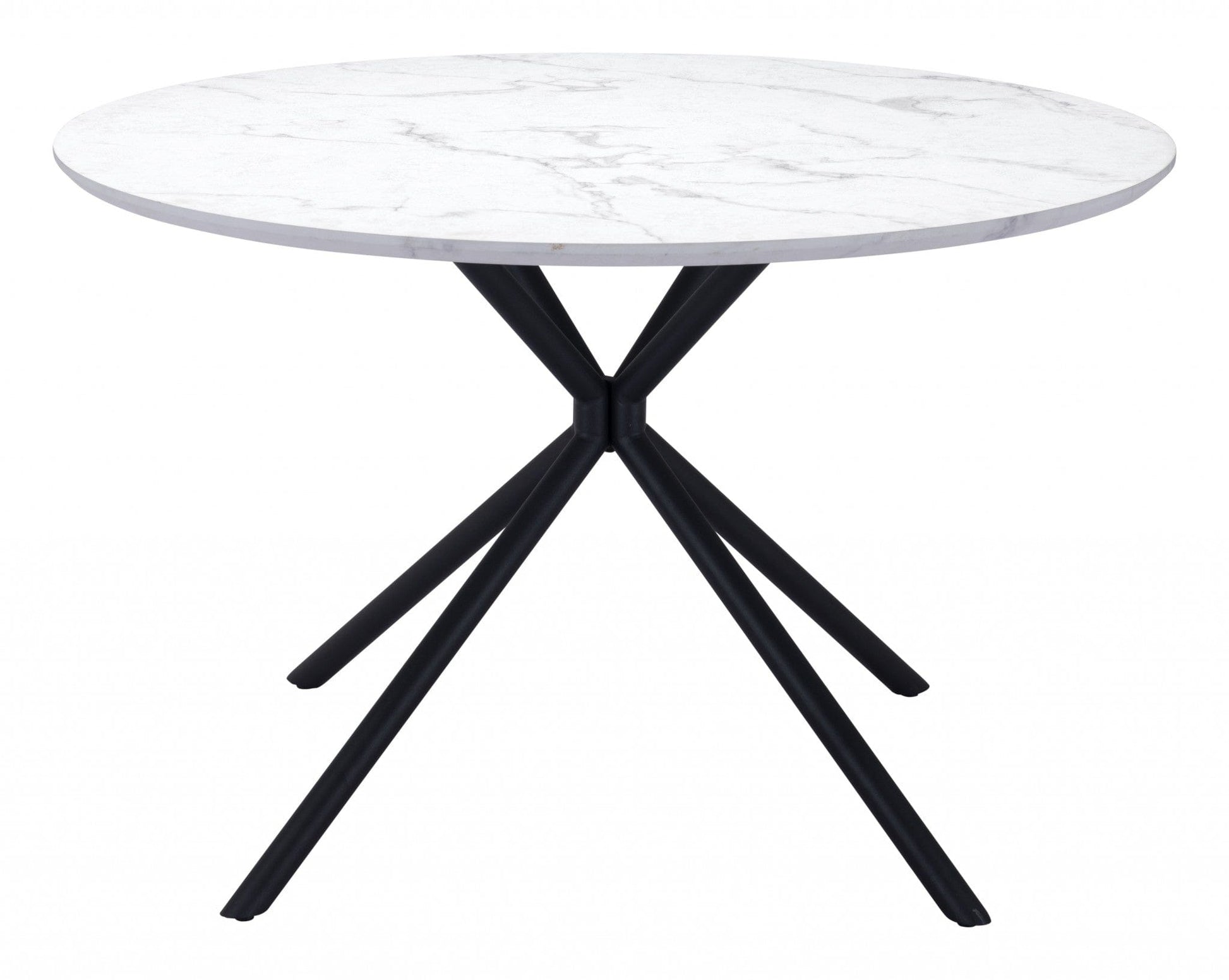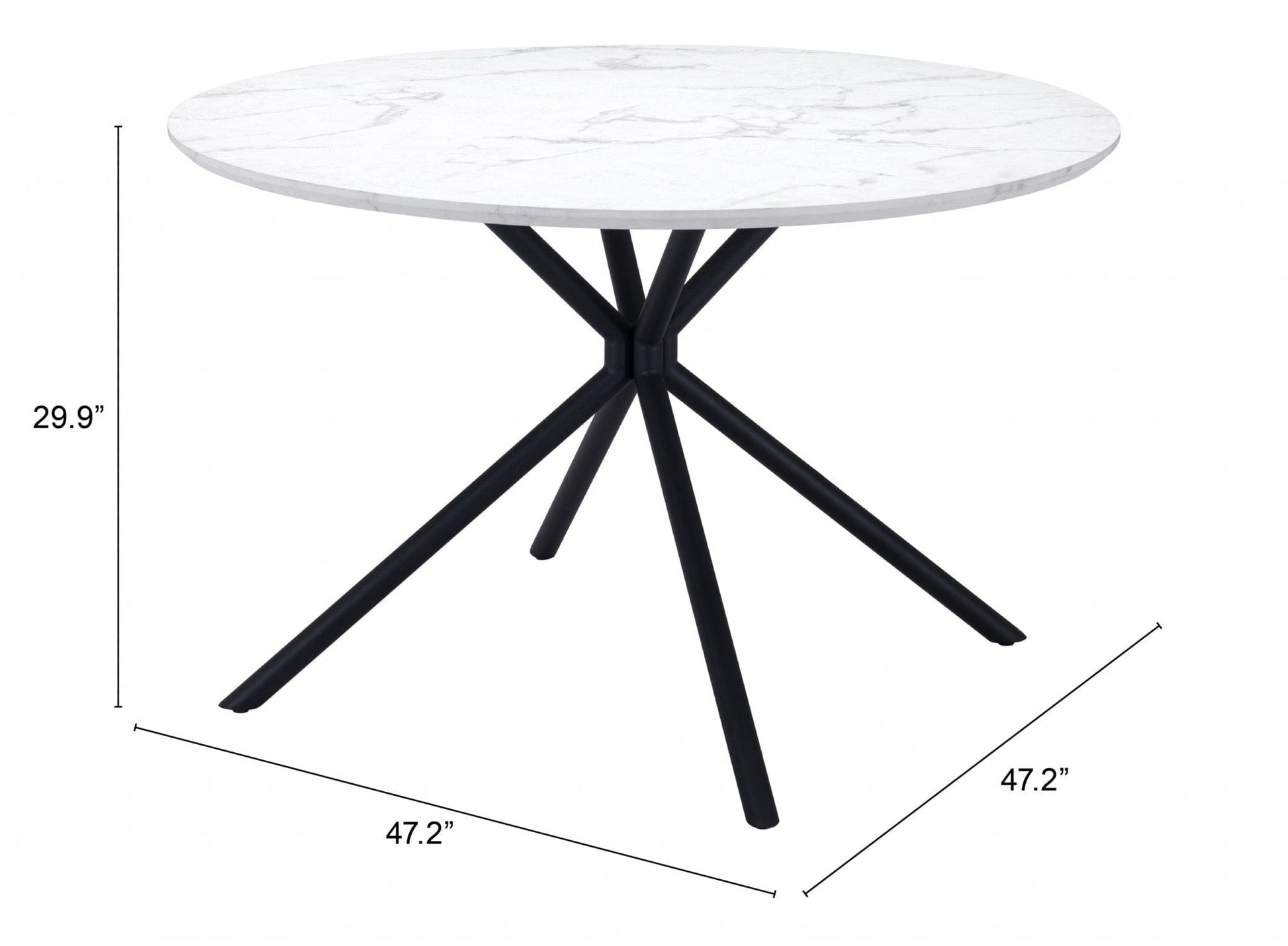 Add handsome, fashionable design to your dining space with this 47" white and black rounded manufactured wood and steel dining table. The base of this table is made from steel in a black color that creates a good looking visual contrast to the white manufactured wood laminate tabletop that features a marble print. The two-tone finish is attractive and fashionable. Seat up to 4 family and friends around your new dining table. Complete your kitchen or dining room with this well made and stylish table. This eye-catching dining table is ready for you to enjoy breakfast for one or entertain your guests. 29.9" H x 47.2" W x 47.2" D