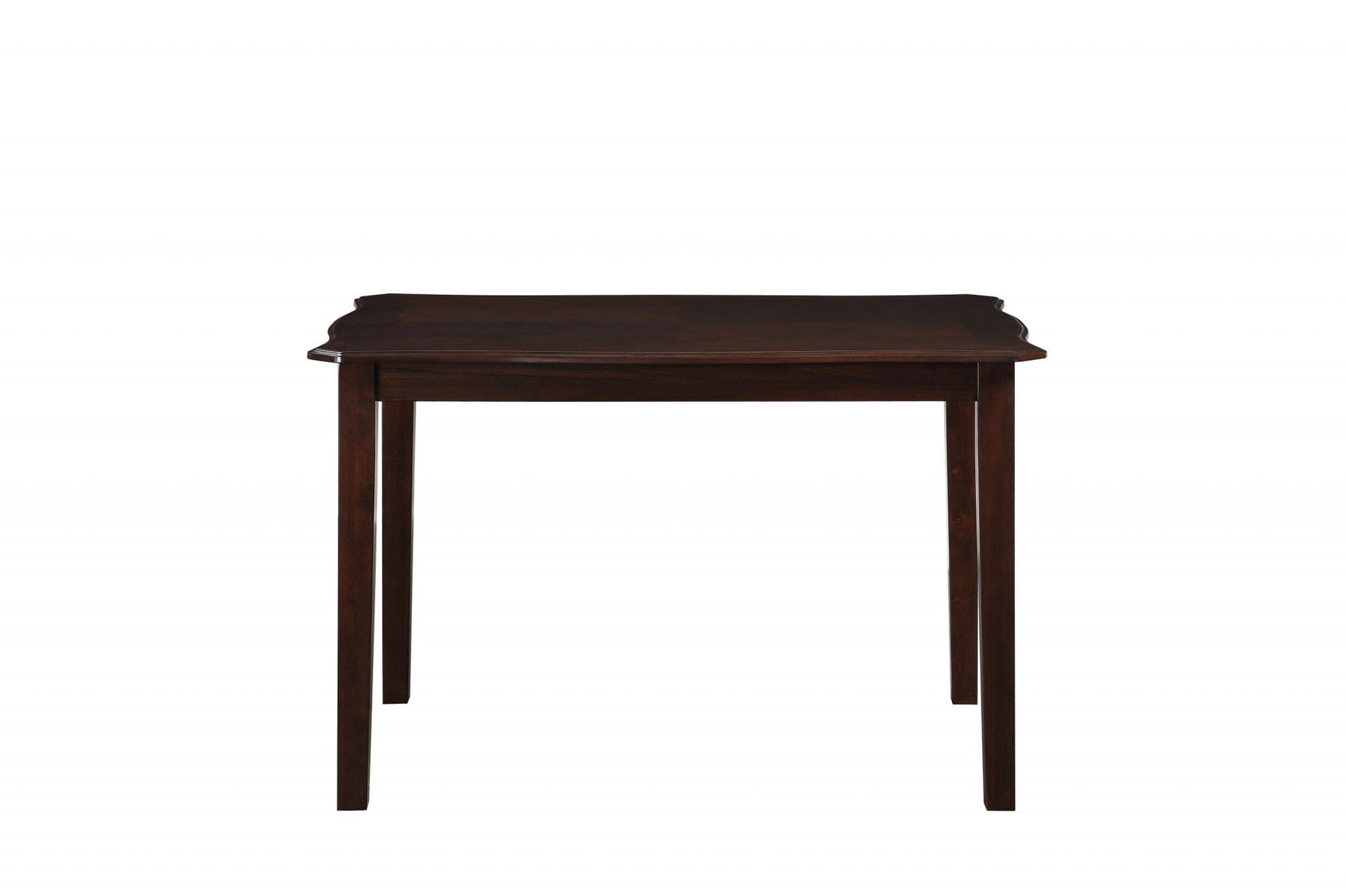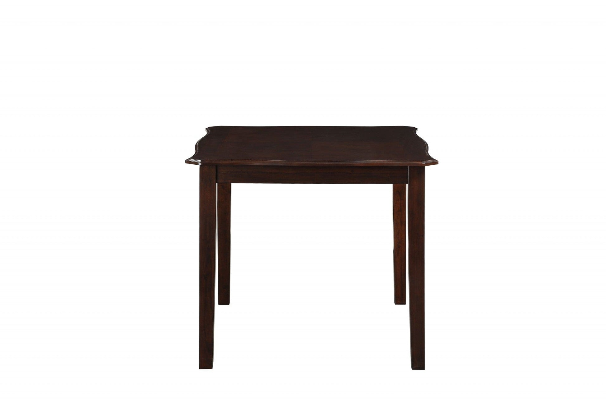 this functional dining set is creatively constructed to be a centerpiece in any dining area. our charming five pieces set comes with all the thrills and frills that will perfectly blend with any eating area. featuring an espresso veneer finished scalloped tabletop collocating with wooden tapered legs with plain apron in espresso finish, this dining set is up to make a stunning decor statement in your home. the accompanying armless chairs and bench ooze luxury and stylish profile with padded seat upholstered in black pu leather meant to easily become a focal point. the seat cushion is three-inch thick, while the weight capacities of the table and chairs are 100lbs and 225lbs respectively. features overlapped x-shape wooden splat backrest.