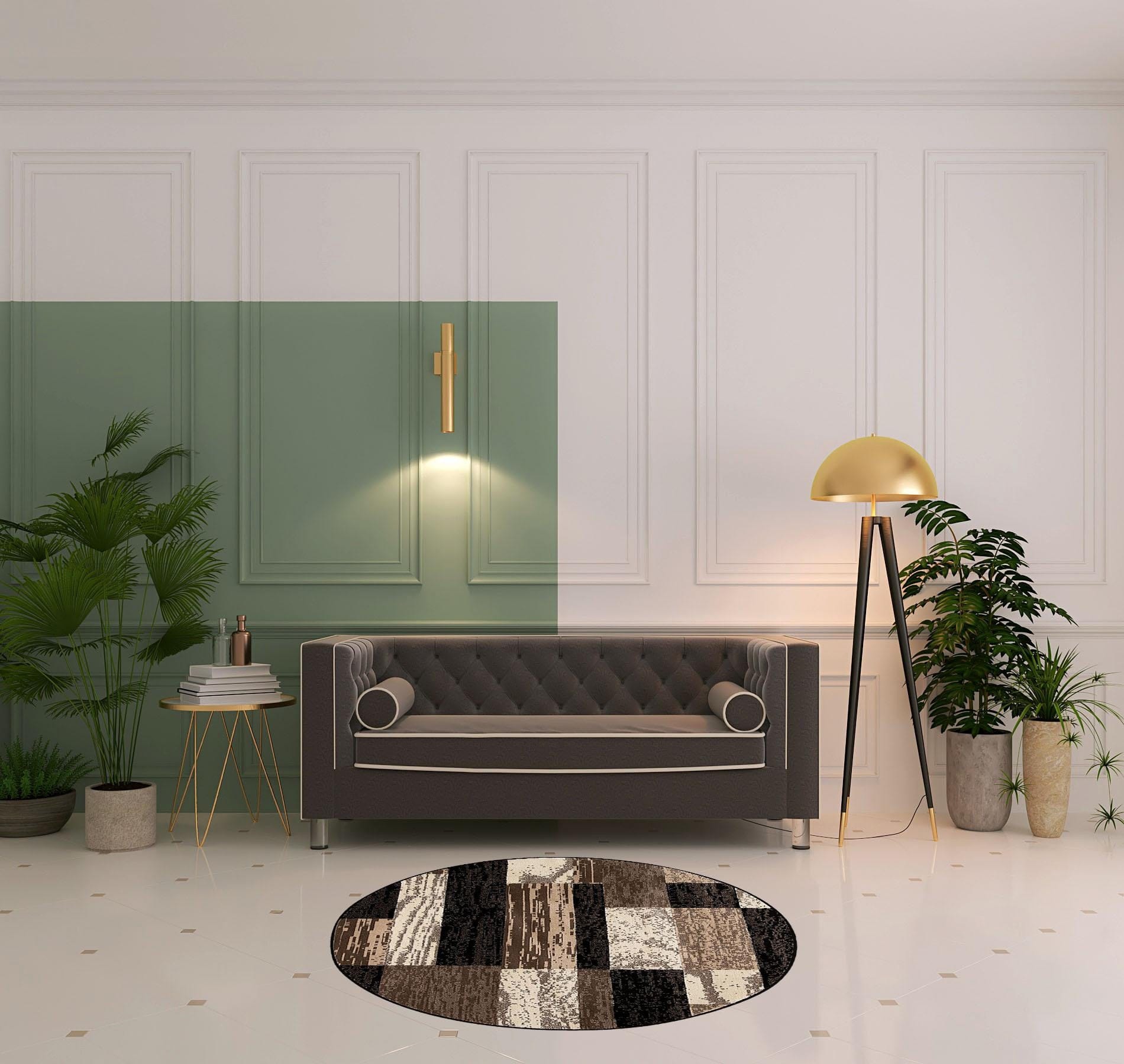 This 5' round chocolate round patchwork power loom stain resistant area rug, is a great way to add warmth to a room. This geometric round shaped rug features a patchwork pattern in chocolate that combines a good looking print with a unique and updated shape. The mix of shape, color, and design gives this rug refreshing visual interest. Made in Turkey, this rug offers high quality combined with good looking designer sensibilities. Ideal for spaces with kids and pets, this rug is stain resistant to help repel stains and spilled liquids. Place this area rug against a hardwood or tile floor and it will enliven your living space with style and sophistication. 0.31" H x 60" W x 60" D