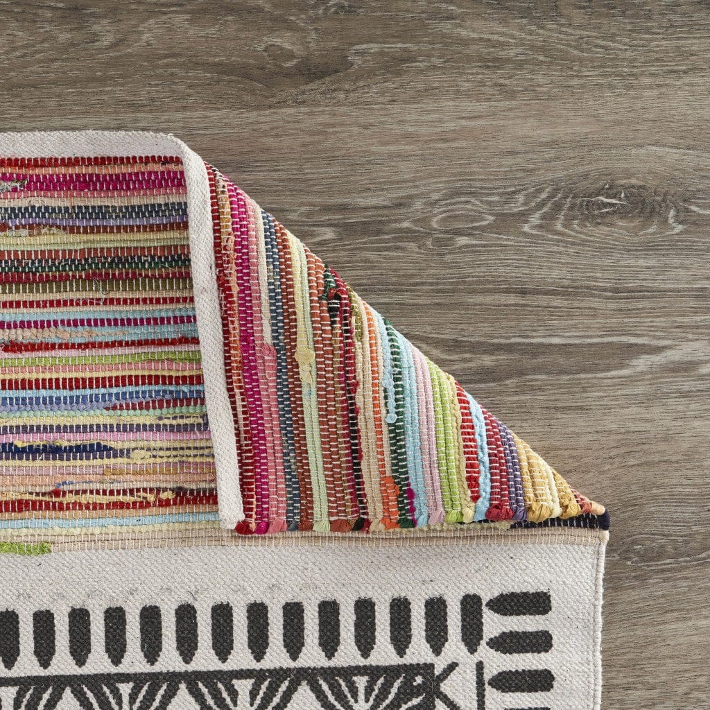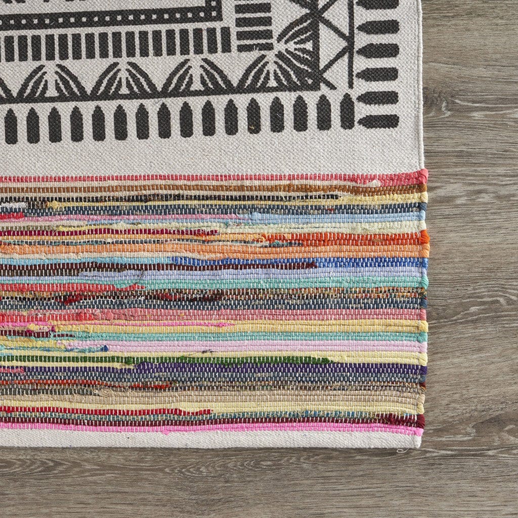 Taking inspiration from global styling, this Grayscale Geometric Center Area Rug features a fine blend of colors and geometrics to accentuate a boho-chic vibe into your living space. With grayscale geometric patterns in the center and colorful Chindi fabrics on both ends, this rug strikes a balance between trend and tradition to be a unique accent on the floor. Handwoven with a cotton and polyester blend that speaks of its durability to last for ages and maintain its pristine appearance for as long as it stays. The rug is constructed in a low pile for a soft and smooth underfoot, making it an ideal accent for indoor areas with high foot traffic. Give your living space a unique update with this area rug that will bring color style to your home. 60” x 84” x 0.25”