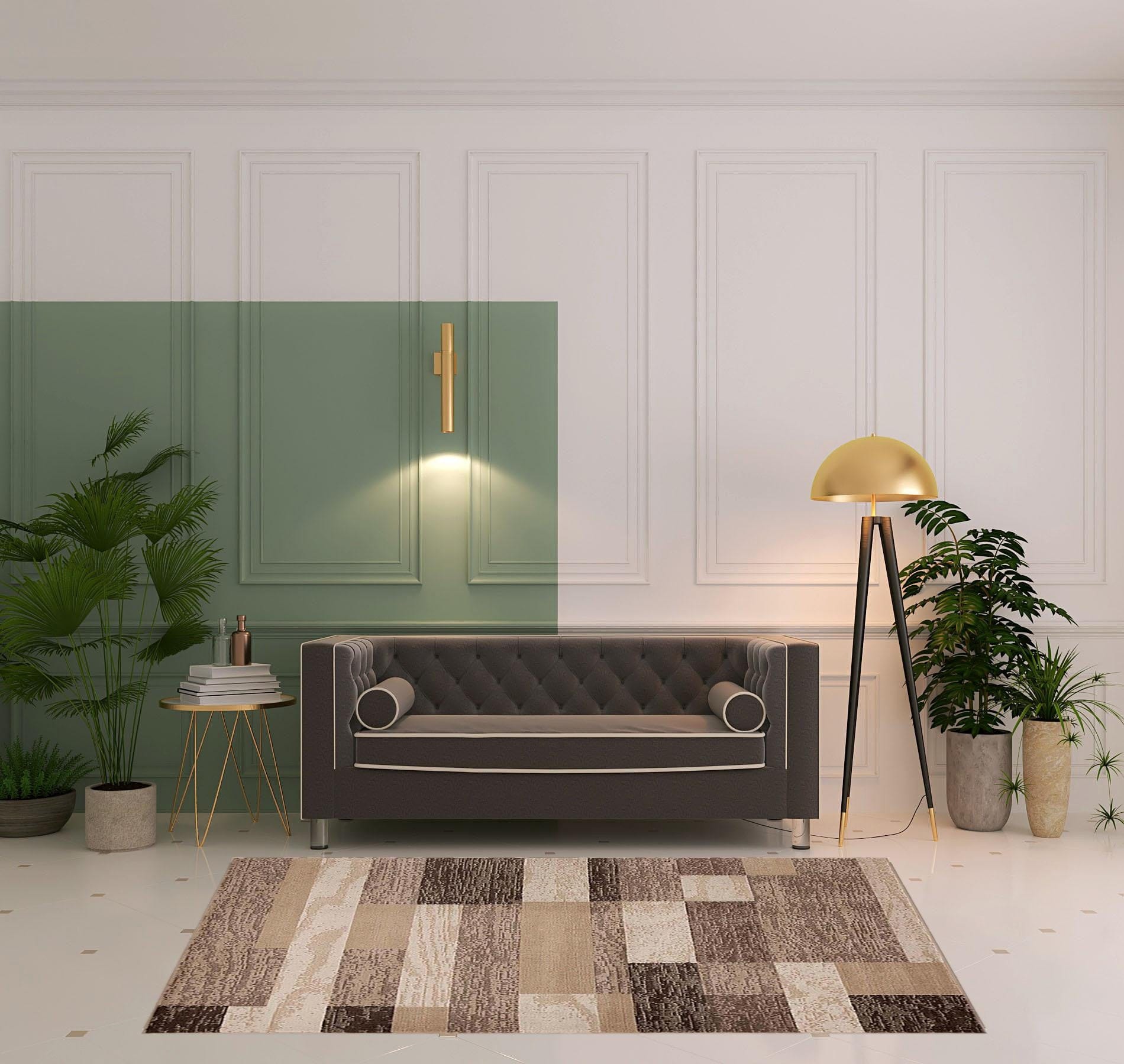 This 5' x 8' beige patchwork power loom stain resistant area rug, is a great way to add warmth to a room. This rectangle shaped rug features a patchwork design in beige to give it visual interest. A classic shape marries with good looking design for your space The coloring of this rug adds a delightfully neutral tone to your home and will easily match with most any decor. Made in Turkey, this rug offers high quality combined with good looking designer sensibilities. Ideal for spaces with kids and pets, this rug is stain resistant to help repel stains and spilled liquids. Place this area rug against a hardwood or tile floor and it will enliven your living space with style and sophistication. 0.31" H x 60" W x 96" D