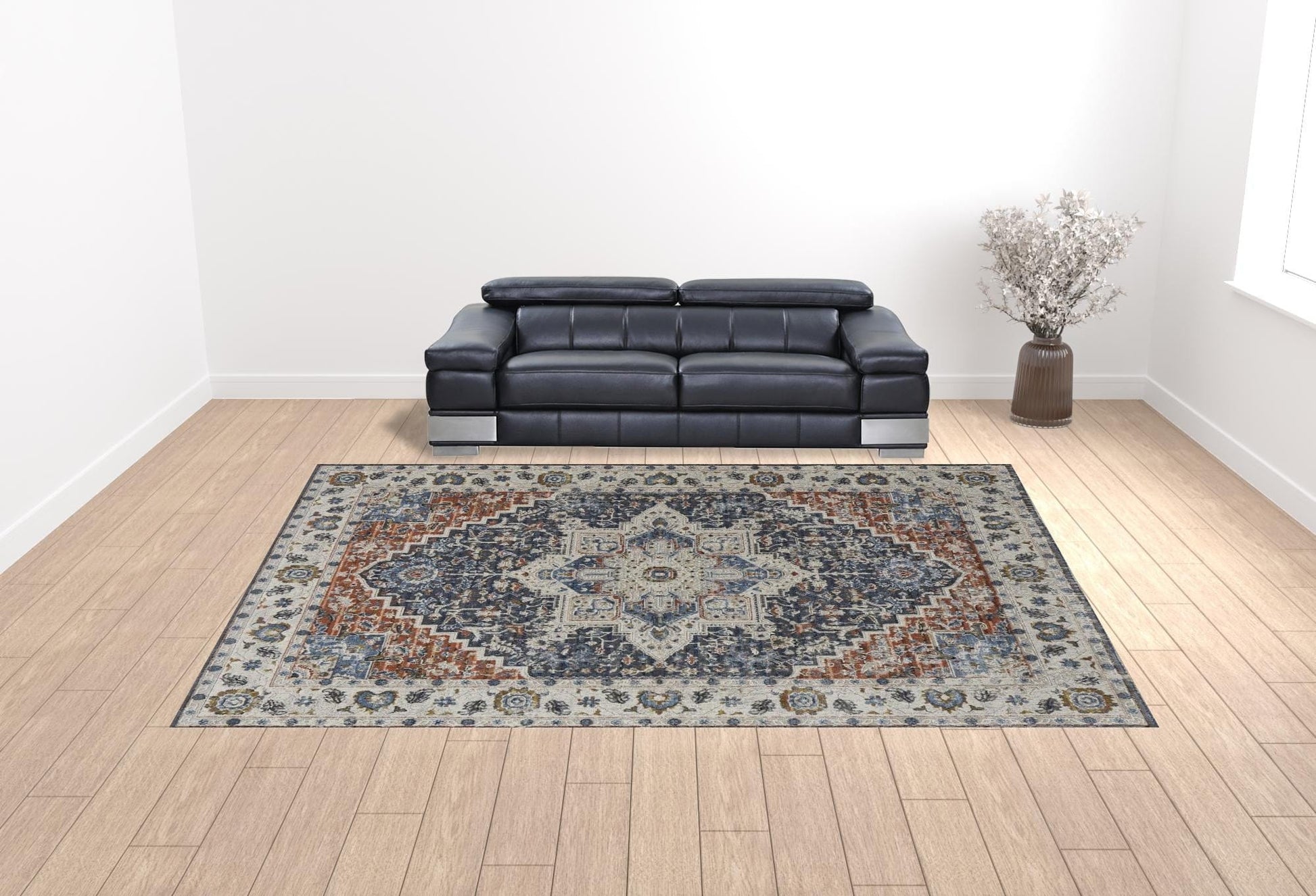 5' X 8' Ivory Blue And Red Floral Power Loom Area Rug With Fringe