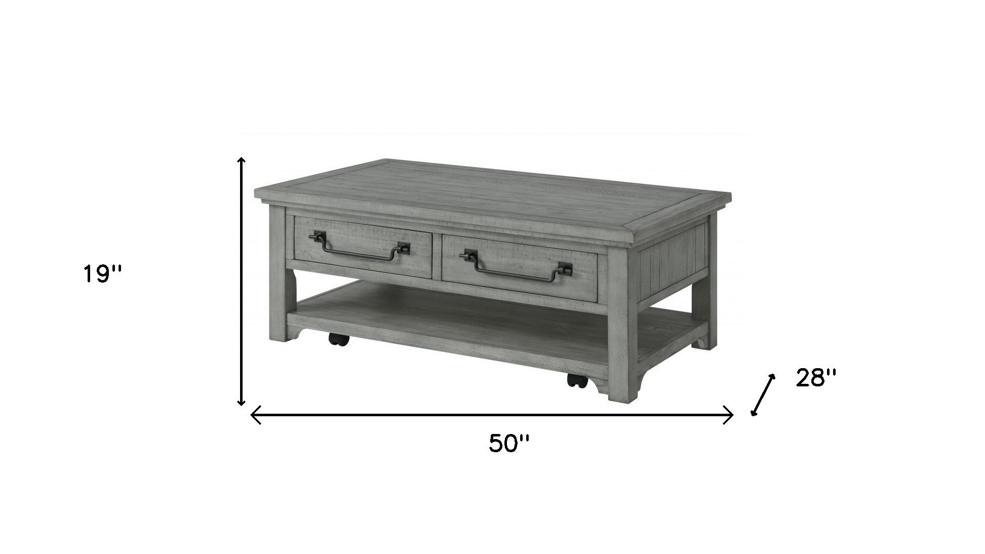 Give your living room, family room, or office the perfect anchor piece with this 50" dove grey solid wood rectangular coffee table with two drawers and shelf. This table features quality construction from solid wood and an updated monotone color scheme with dove grey as the main color on both the top and the base. Includes a single shelf for handy storage or display space. This classic rectangular table will be a great accent in any room Wheels give the table added versatility and mobility if needed. It has a fresh design that will definitely breathe some fresh air into your interior. This coffee table is the sturdy, reliable and stylish answer to your living room needs. 19" H x 50" W x 28" D
