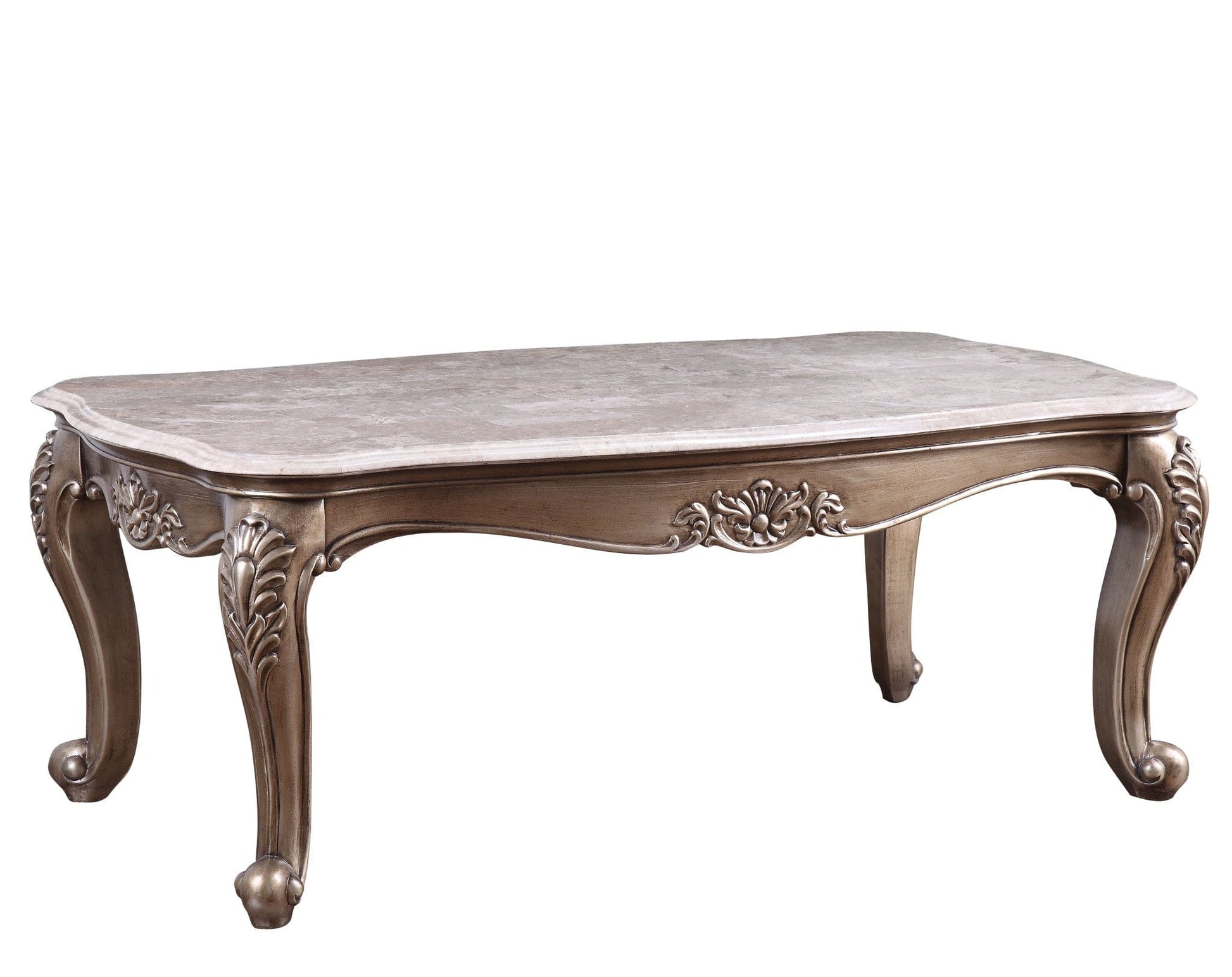 Make a statement with the 52" brown and champagne faux marble and polyresin rectangular coffee table and infuse a dash of character and personality into your space. The marble faux marble top of this table is a nice visual contrast to the high quality, champagne polyresin of the base. This rectangular table is an classic yet updated way to accent your room. Queen Anne Legs are a sign of high quality and classic construction. It has a fresh design that will definitely breathe some fresh air into your interior. This coffee table is the sturdy, reliable and stylish answer to your living room needs. 20" H x 52" W x 32" D