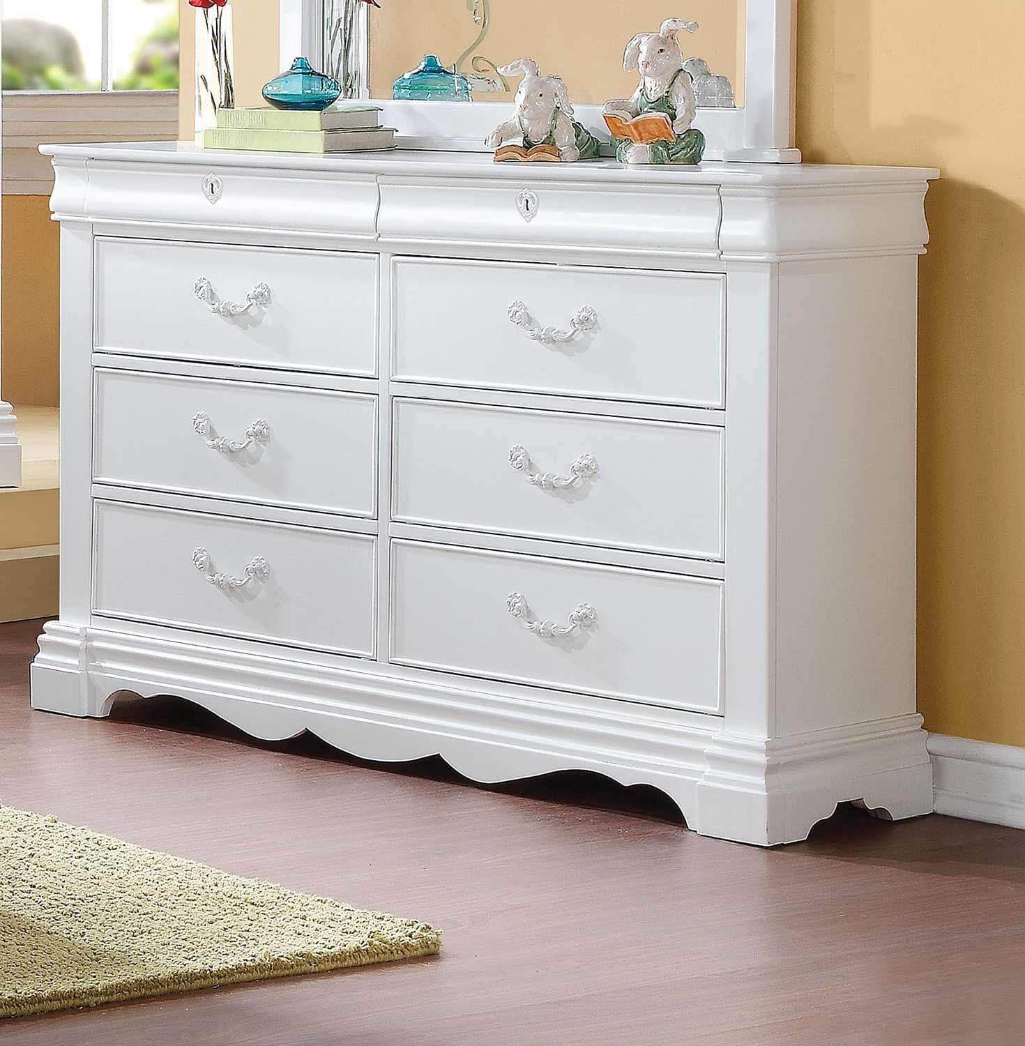 Add personality to your bedroom style and a feeling of coziness with this 56" white solid wood vintage style eight drawer double dresser. This horizontal double dresser has column style drawers and a wide top surface area to help you with your daily dressing essentials. Loaded with capacity, this piece is equipped with eight easy open drawers for practical and good looking clothing storage. This dresser is built to last from high quality solid wood, The white coloration of this piece is neutral and will blend easily with most any decor. 37" H x 56" W x 16" D