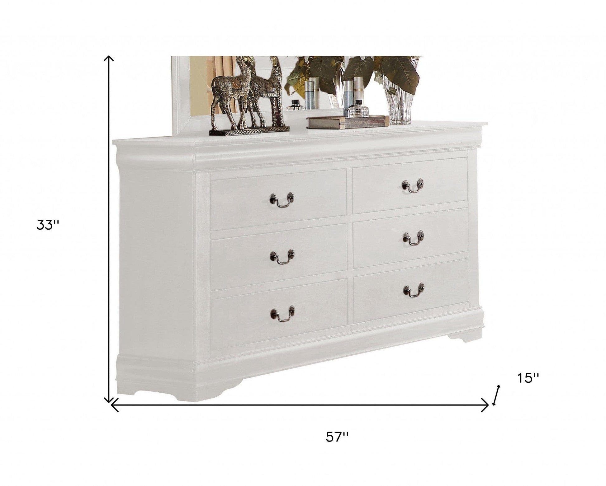 Enhance your room into a visually delightful and highly functional space with this 57" white solid wood six drawer double dresser. Designed for you to stand in front of and get ready, this horizontal double dresser has a convenient and wide top area for your getting ready needs and supplies. Loaded with capacity, this piece is equipped with six easy open drawers for practical and good looking clothing storage. This dresser is built to last from high quality solid wood, The white coloration of this piece is neutral and will blend easily with most any decor. 33" H x 57" W x 15" D