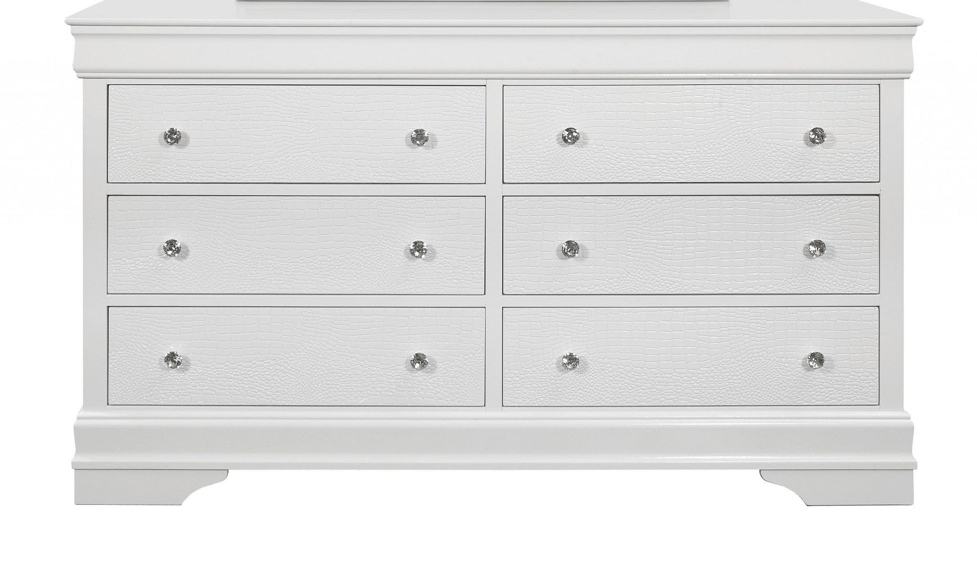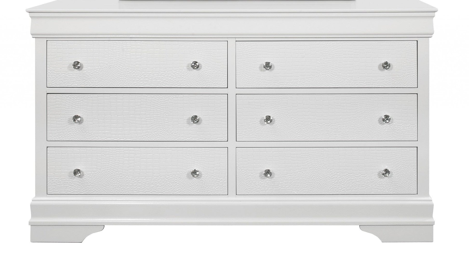 Add personality to your bedroom style and a feeling of coziness with this 58" metallic white solid wood six drawer double dresser. Designed for you to stand in front of and get ready, this horizontal double dresser has a convenient and wide top area for your getting ready needs and supplies. Loaded with capacity, this piece is equipped with six easy open drawers for practical and good looking clothing storage. This dresser is built to last from high quality solid wood,. 33" H x 58" W x 16" D