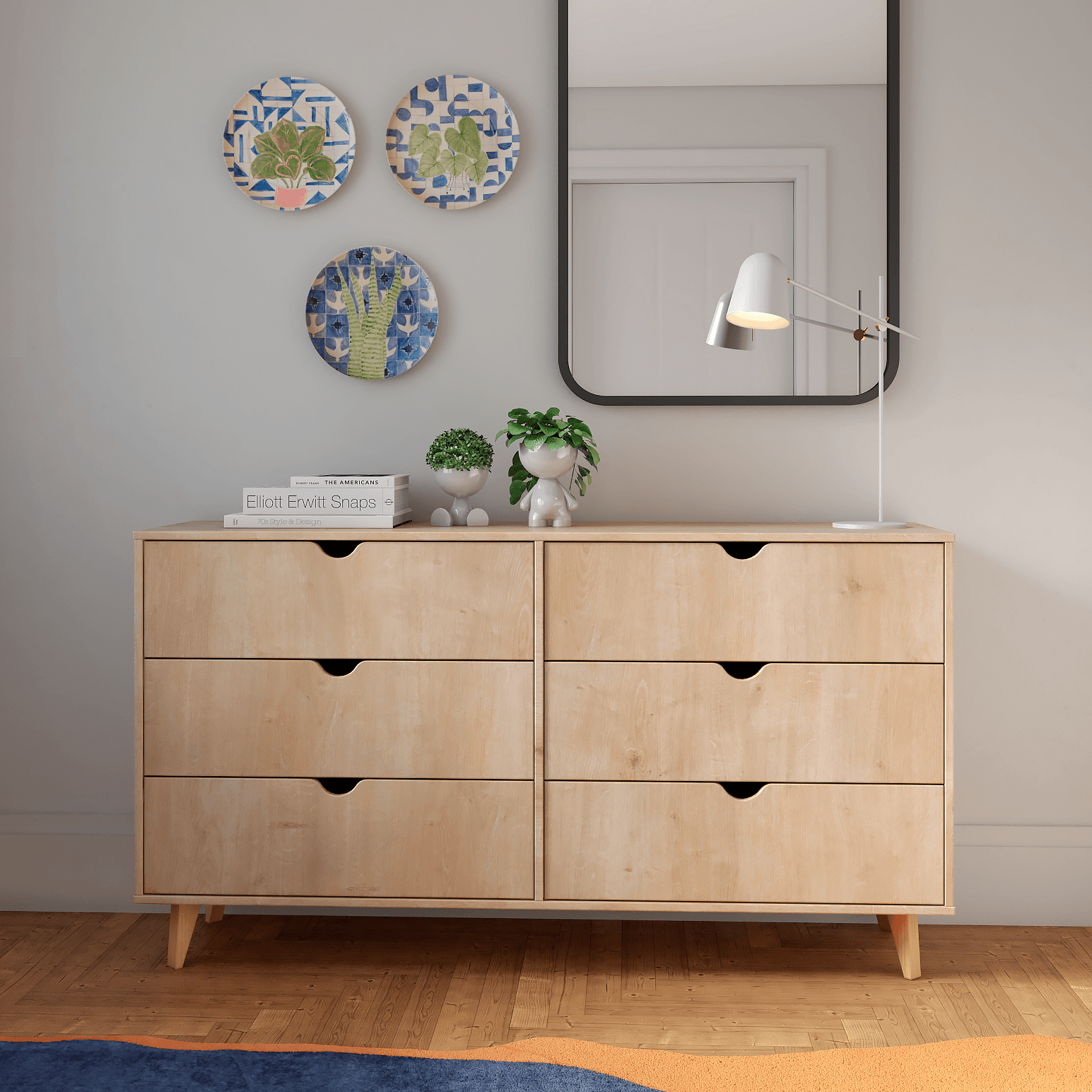 Add personality to your bedroom style and a feeling of coziness with this 59" natural wood manufactured wood six drawer double dresser. Designed for you to stand in front of and get ready, this horizontal double dresser has a convenient and wide top area for your getting ready needs and supplies. Loaded with capacity, this piece is equipped with six easy open drawers for practical and good looking clothing storage. Its a high quality piece, made from high grade manufactured wood. 32" H x 59" W x 16" D