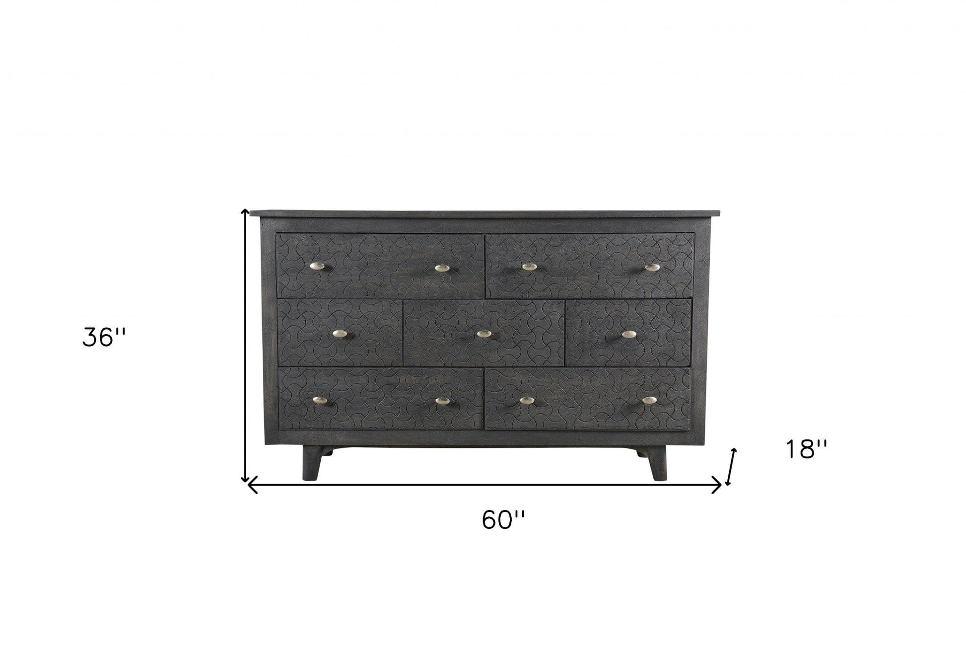This 60" gray wash solid wood seven drawer triple dresser is a practical and good looking accent for your bedroom storage and organizational needs. Designed for you to stand in front of and get ready, this horizontal triple dresser has a convenient and wide top area for your getting ready needs and supplies. Loaded with capacity, this piece is equipped with seven easy open drawers for practical and good looking clothing storage. This dresser is built to last from high quality solid wood,. 36" H x 60" W x 18" D