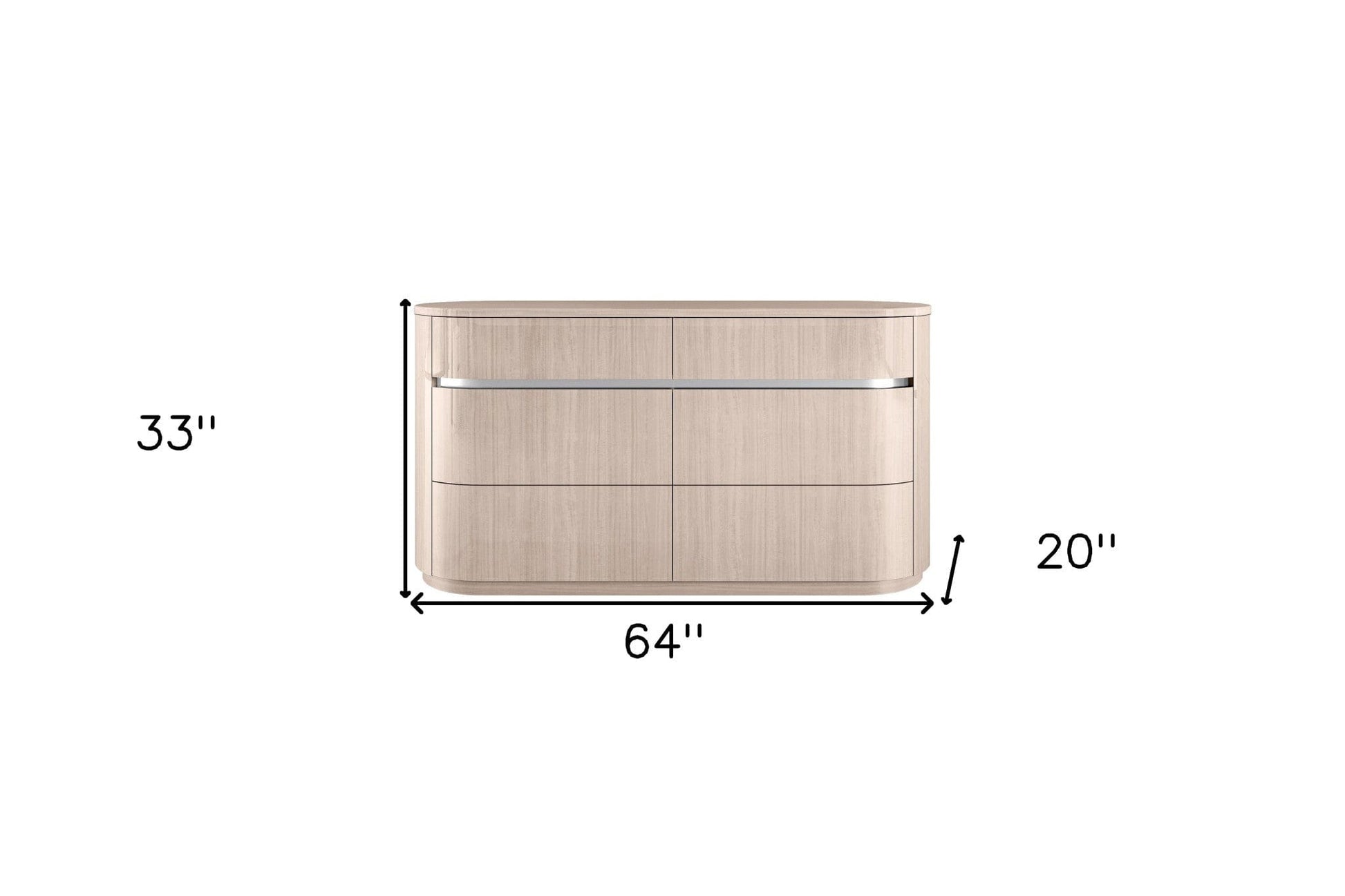 This 64" beige manufactured wood six drawer double dresser is a practical and good looking accent for your bedroom storage and organizational needs. Designed for you to stand in front of and get ready, this horizontal double dresser has a convenient and wide top area for your getting ready needs and supplies. Loaded with capacity, this piece is equipped with six easy open drawers for practical and good looking clothing storage. Its a high quality piece, made from high grade manufactured wood. The beige coloration of this piece is neutral and will blend easily with most any decor. 33" H x 64" W x 20" D