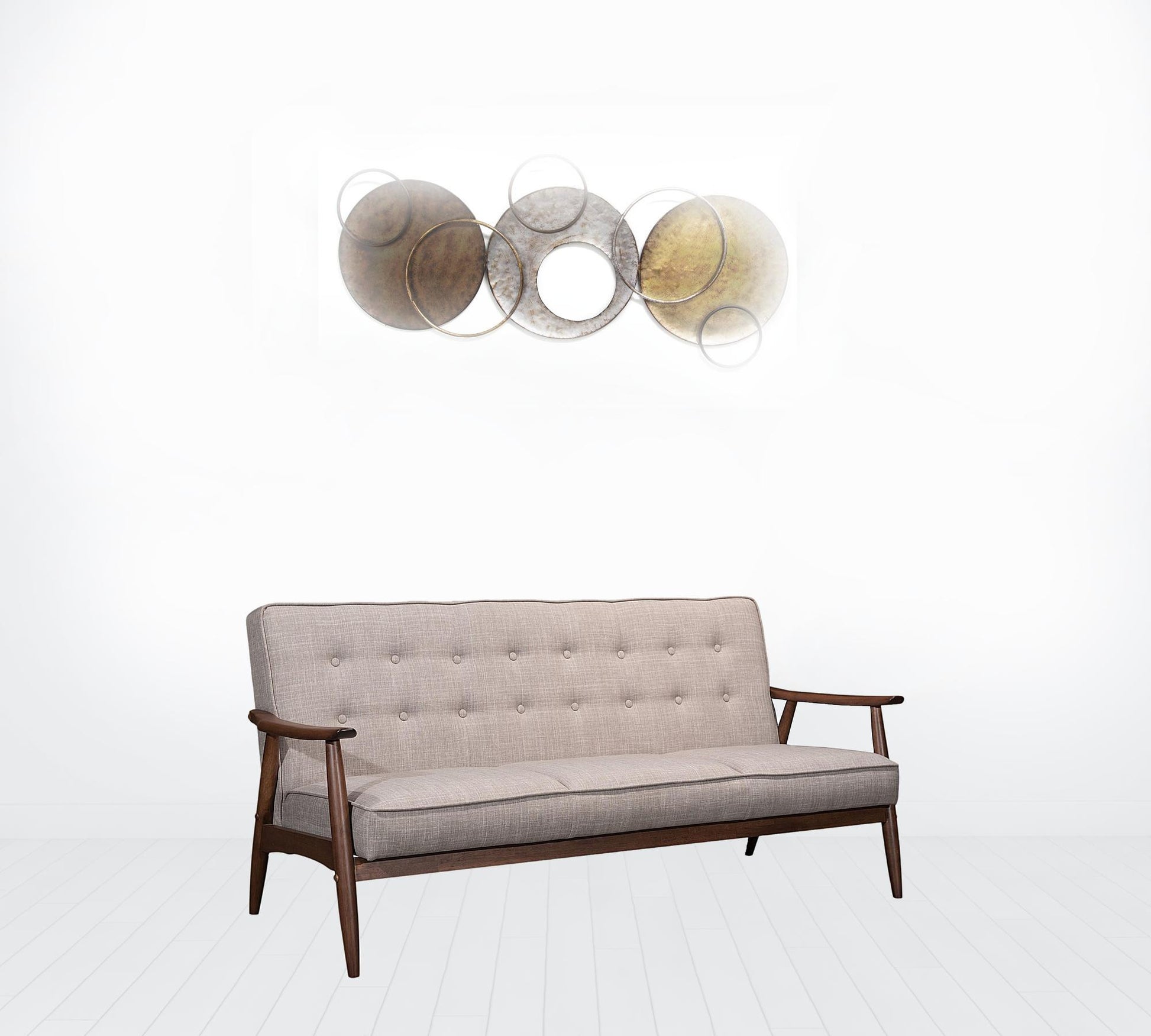 69" Taupe Beige Tufted Fabric And Brown Solid Wood Sofa