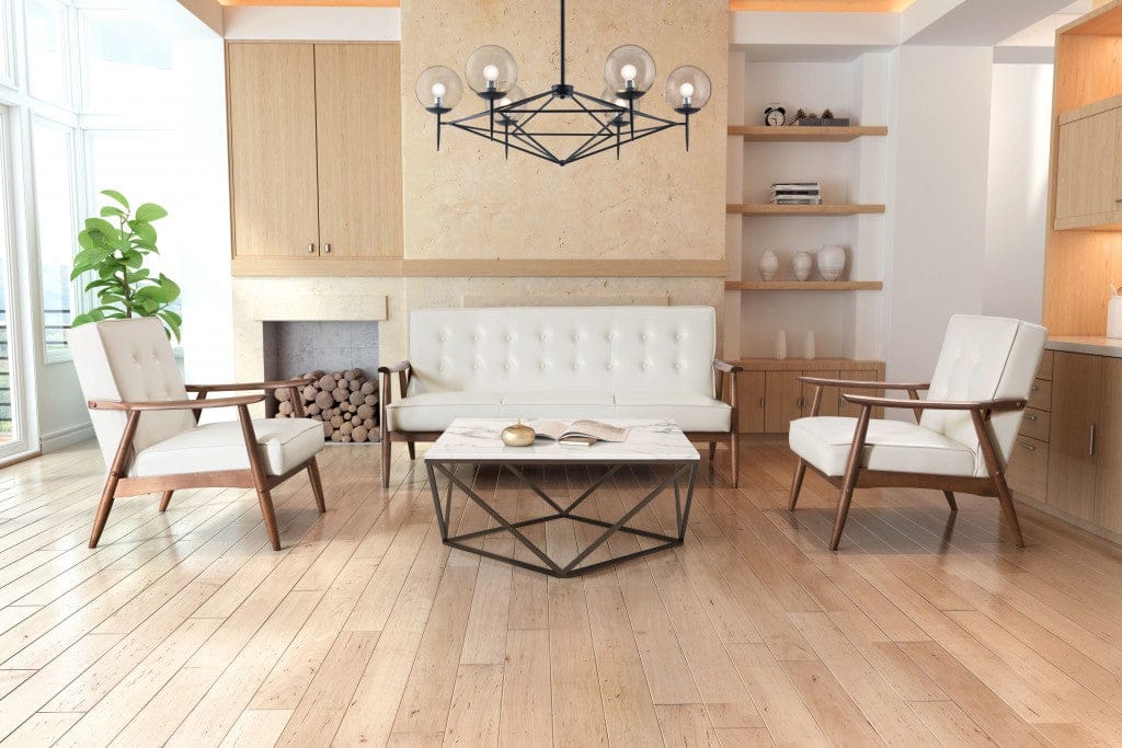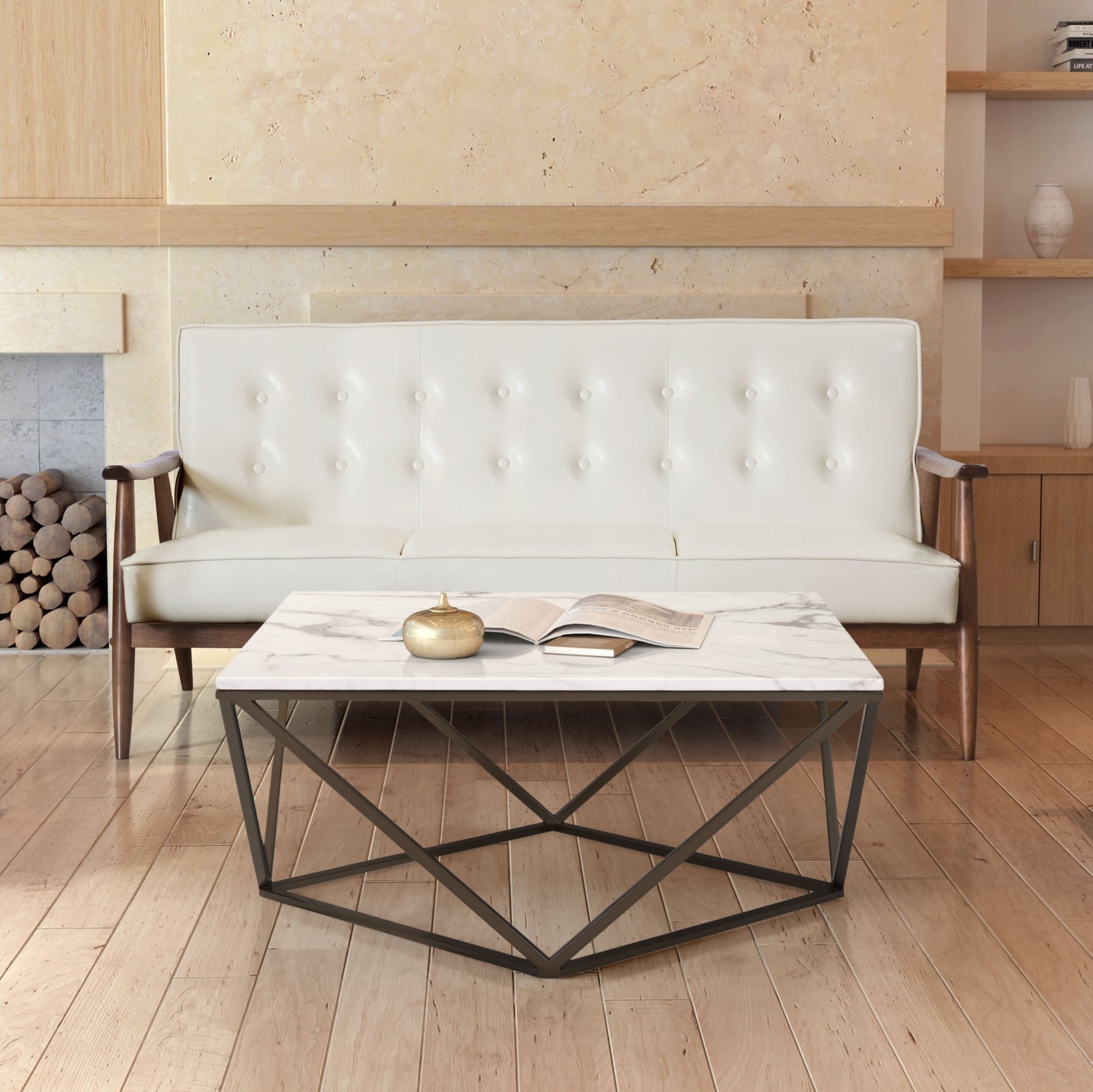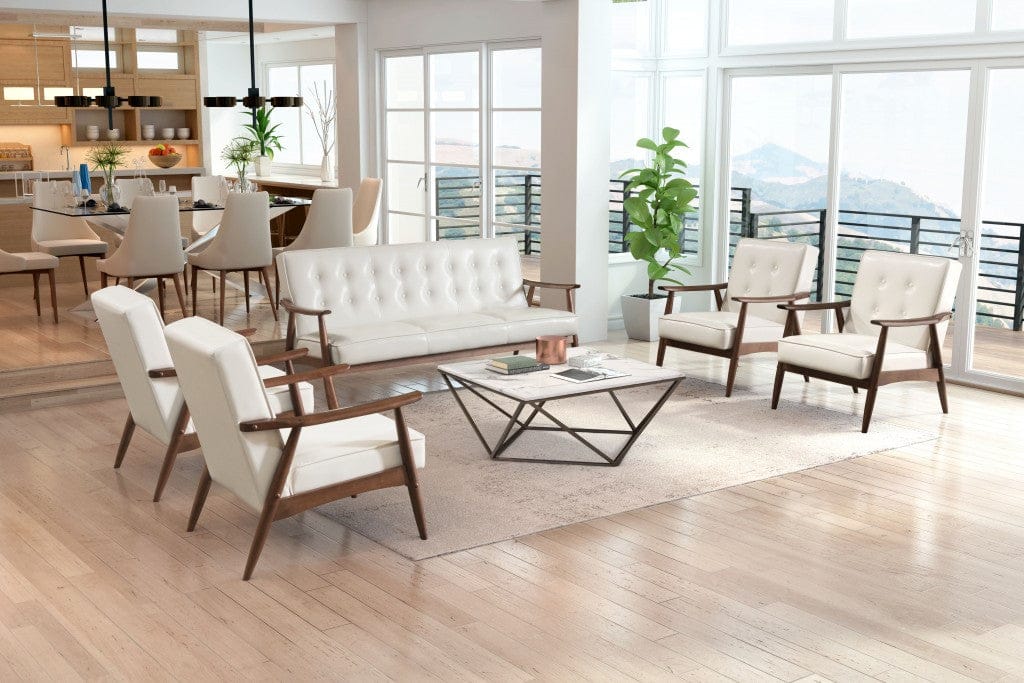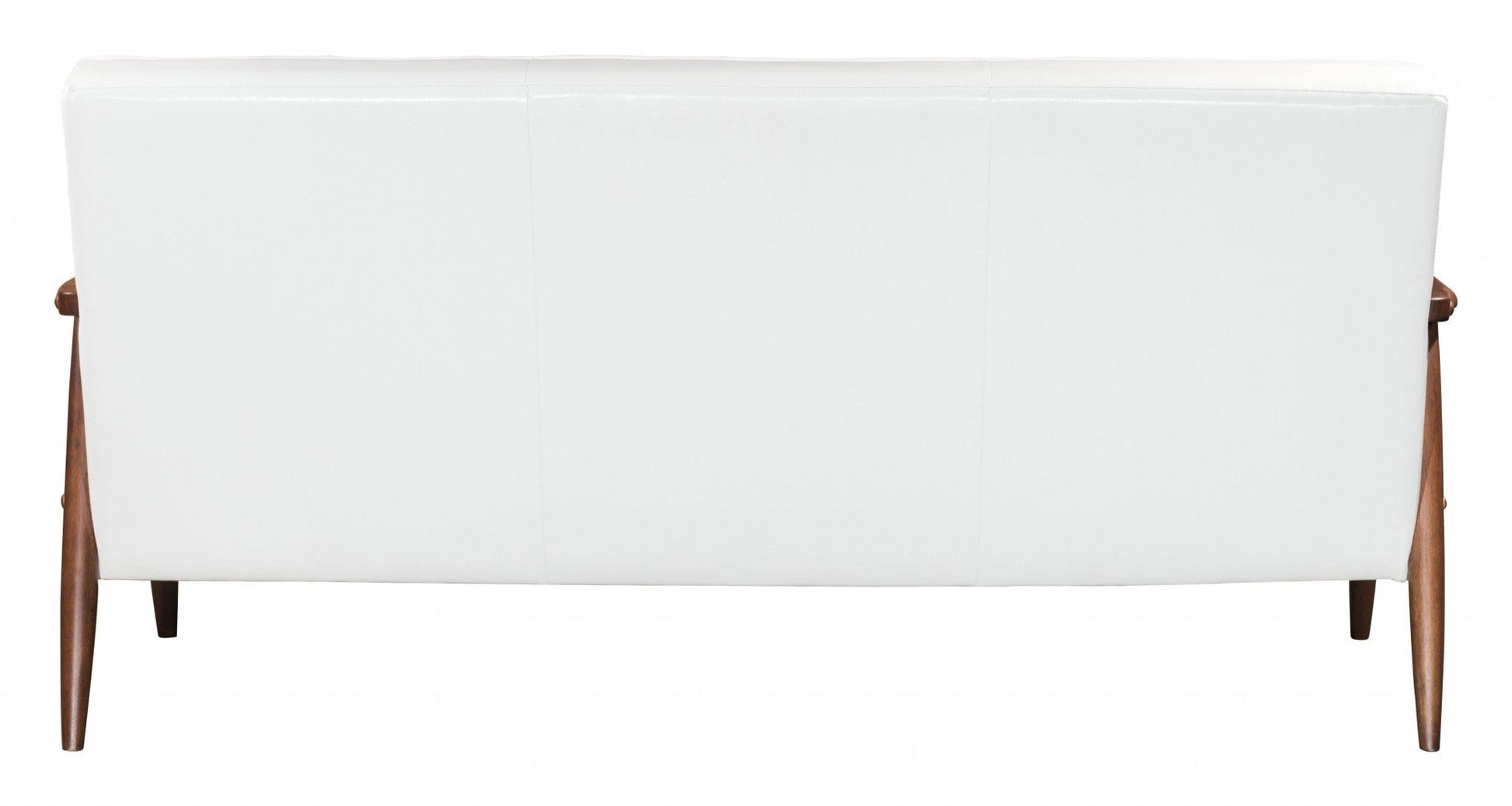 This 69" white button tufted faux leather and brown standard sofa is made from sturdy and resilient polyurethane that will look and feel like leather. The mix of the faux leather with the sturdy solid wood walnut finish frame gives this a great modern look with a slight retro vibe. Solid colors give you lots of decorative options and are easy to work into your decor scheme. Square arms offer a comfy place to rest. A great showpiece for your room, this sofa is a must have. 32.9" H x 68.5" W x 32.1" D