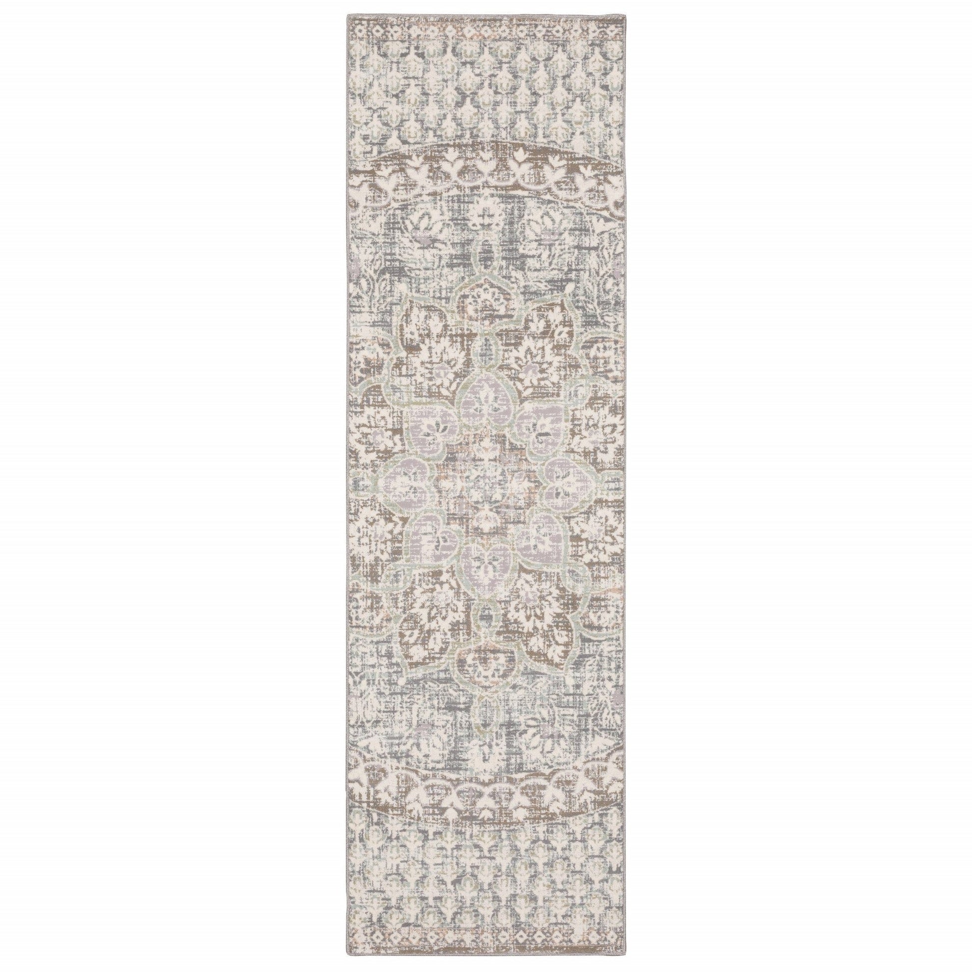 7' Ivory Grey Distressed Oversize Medallion Indoor Runner Rug