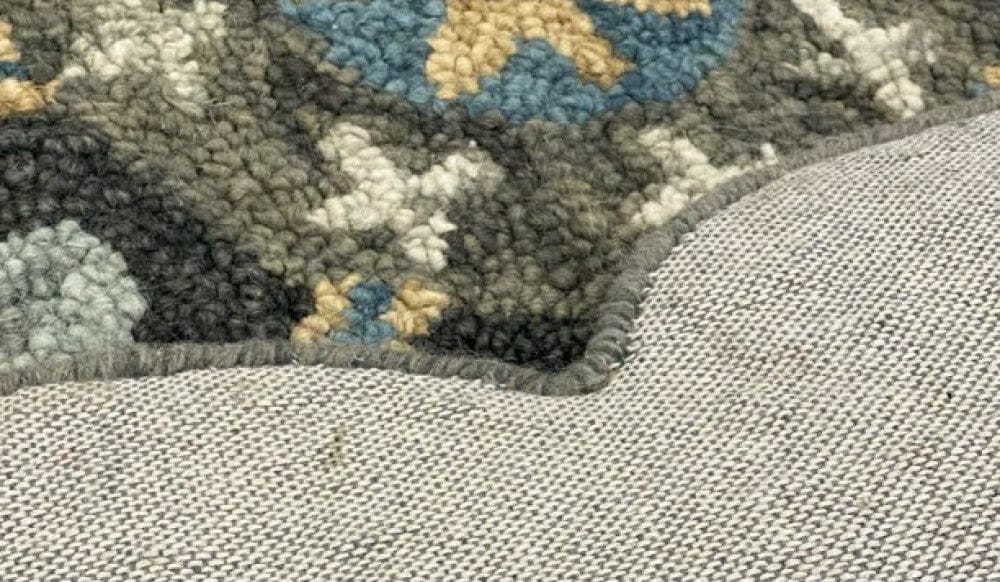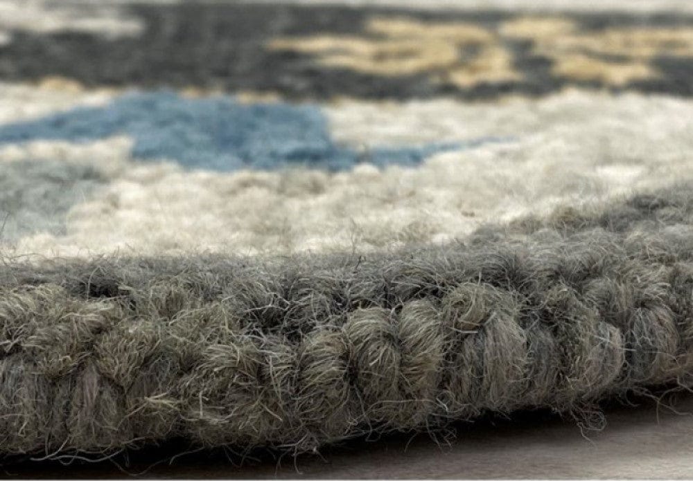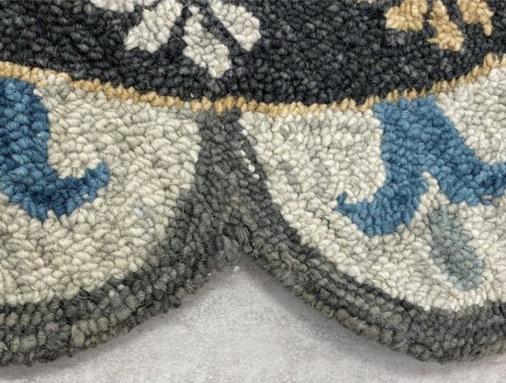 Bring an elegant and eye-catching botanical presence into your home with this Round Gray Border Floral Medallion Area Rug that features a sophisticated palette with intriguing patterns. Boasting an array of three medallions in black and blue over a distressed gray-toned base which is emphasized by the scalloped edge for a definitive look. Hand-hooked with 100% virgin wool which is naturally breathable in all conditions and durable enough to last for ages while resisting stains and wrinkles even after years of usage. The soft and sumptuous medium pile construction adds a layer of luxury and warmth under the feet, making it a great choice to layer the floor. The cool tones and tasteful design of this area rug make it a versatile piece to complement your interior decor without overpowering the place. 87”
