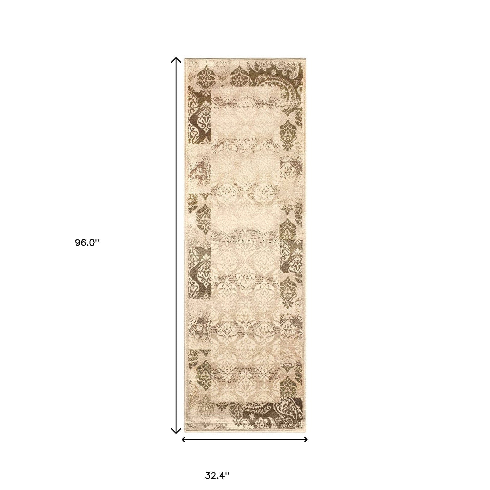 8' Beige Damask Power Loom Distressed Stain Resistant Runner Rug