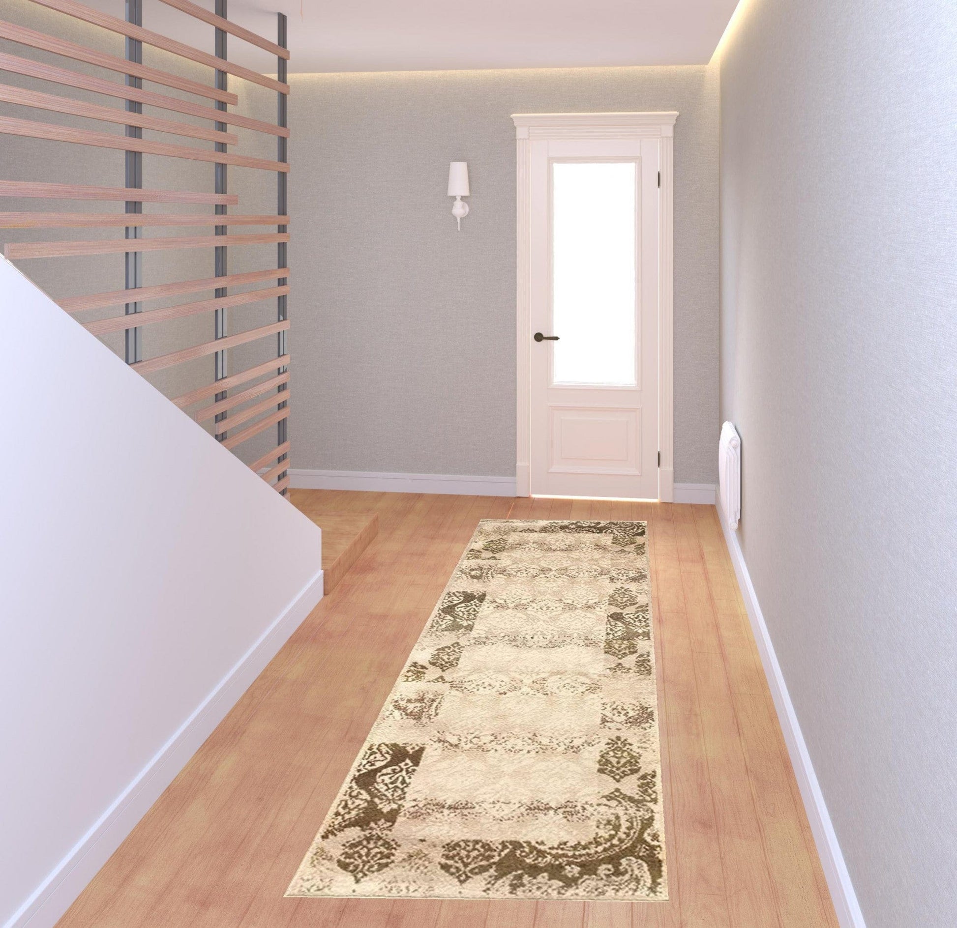 Add great coloration and comfortable texture to your space with this 8' beige damask power loom distressed stain resistant runner rug. This runner shaped rug features a damask design in beige to give it visual interest. A classic shape marries with good looking design for your space The coloring of this rug adds a delightfully neutral tone to your home and will easily match with most any decor. Made in Turkey, this rug offers high quality combined with good looking designer sensibilities. Ideal for spaces with kids and pets, this rug is stain resistant to help repel stains and spilled liquids. Area Rugs help to give warmth and sense of home to your space. 0.31" H x 32.4" W x 96" D